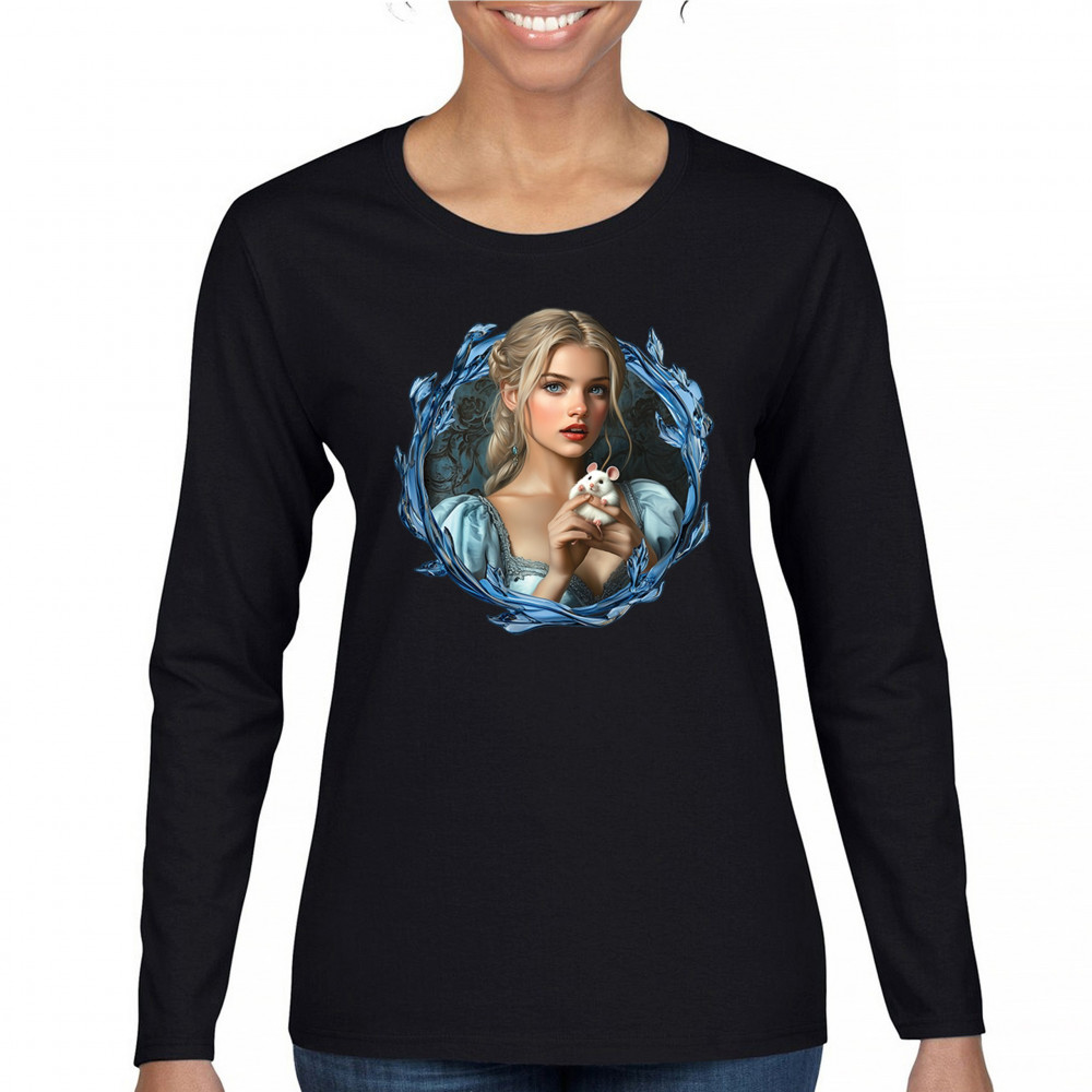 A whimsical design inspired by fairytales and Cinderella magic, featuring a blonde girl in a blue dress holding a white mouse. The icy blue leaf frame evokes enchantment and transformation. With soft, vintage tones and a dreamy feel, it’s a charming tribute to kindness, fantasy, animal companionship, and gentle storytelling magic.