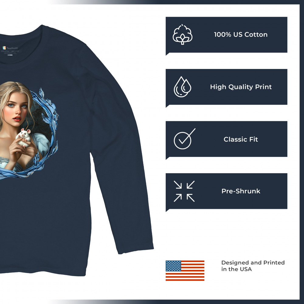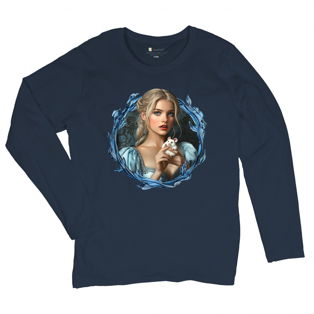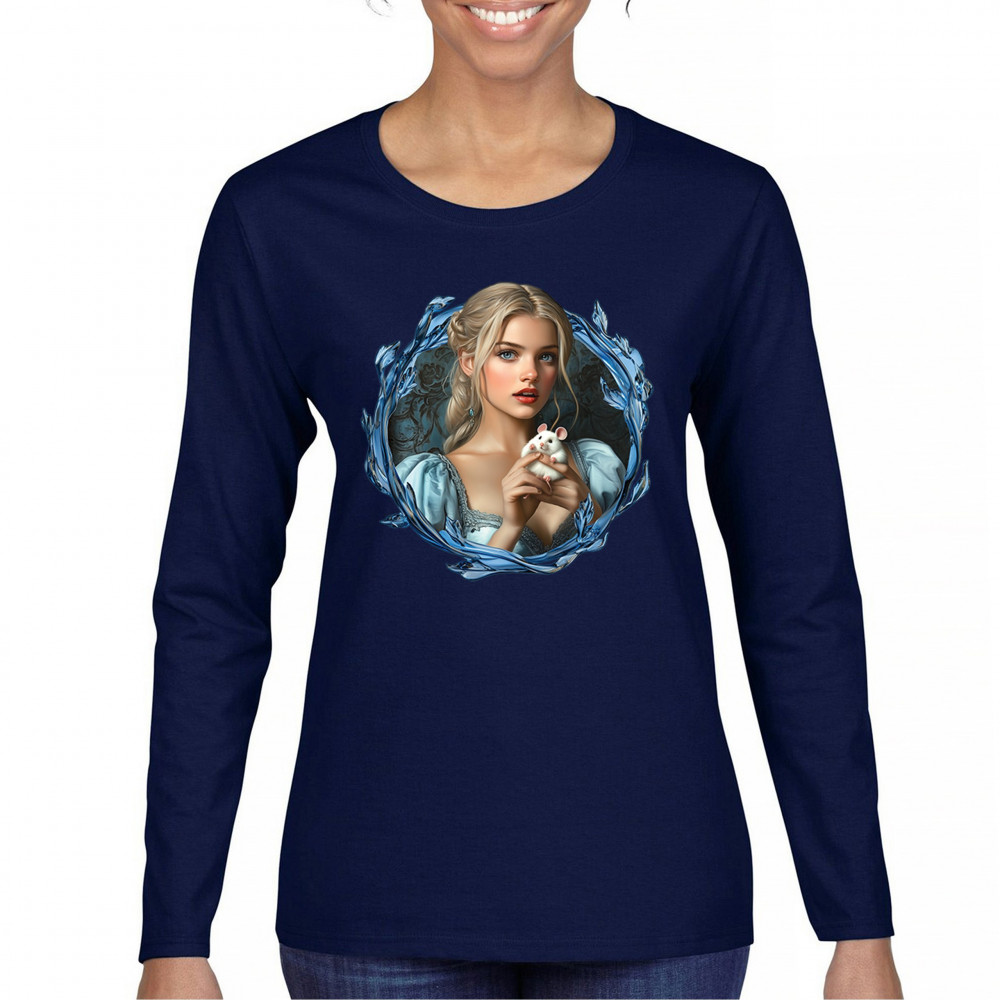 A whimsical design inspired by fairytales and Cinderella magic, featuring a blonde girl in a blue dress holding a white mouse. The icy blue leaf frame evokes enchantment and transformation. With soft, vintage tones and a dreamy feel, it’s a charming tribute to kindness, fantasy, animal companionship, and gentle storytelling magic.
