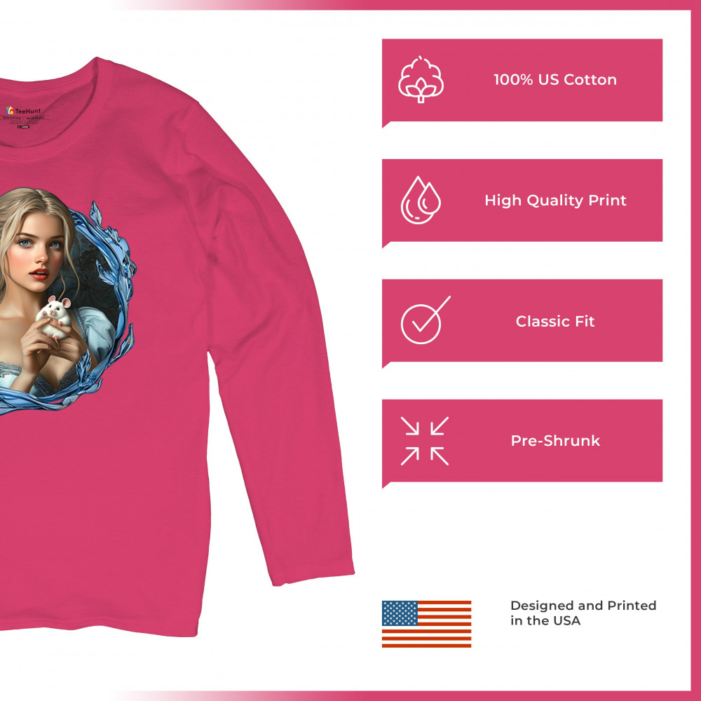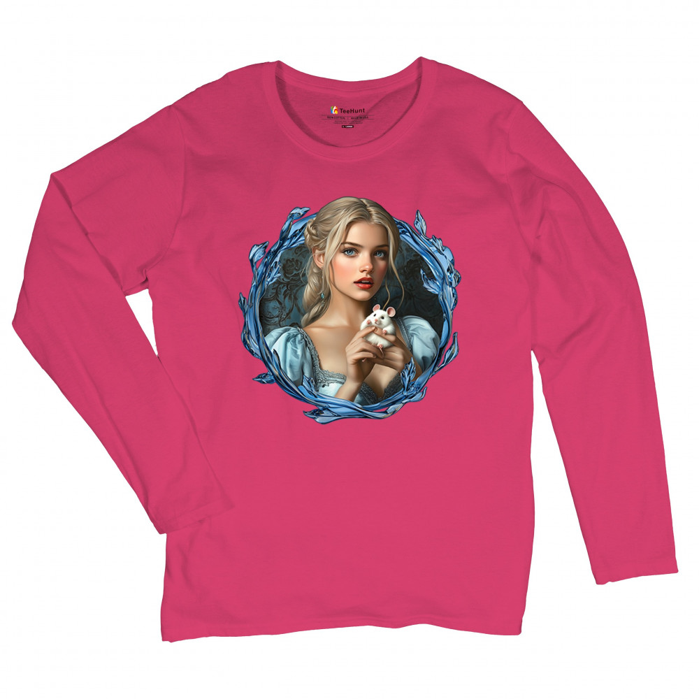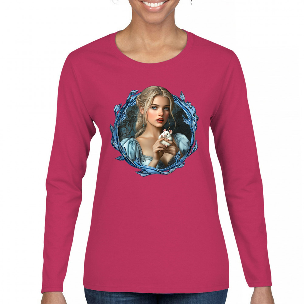 A whimsical design inspired by fairytales and Cinderella magic, featuring a blonde girl in a blue dress holding a white mouse. The icy blue leaf frame evokes enchantment and transformation. With soft, vintage tones and a dreamy feel, it’s a charming tribute to kindness, fantasy, animal companionship, and gentle storytelling magic.
