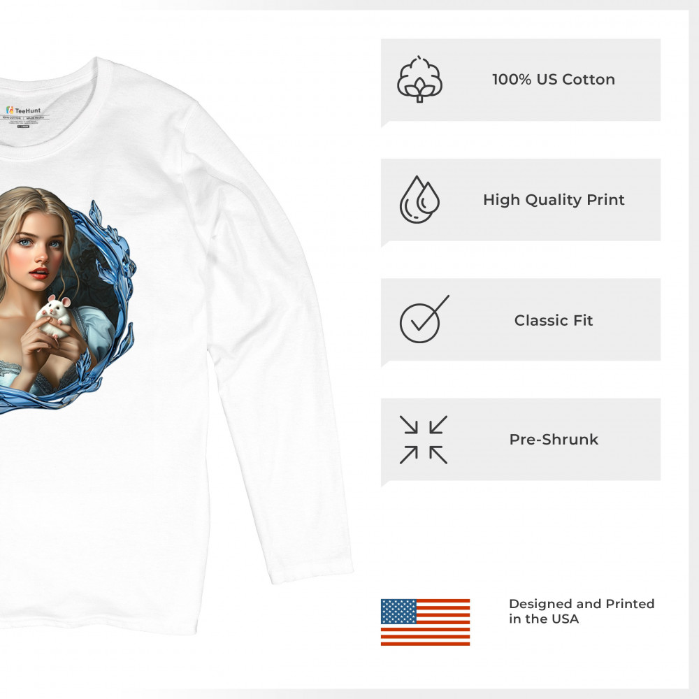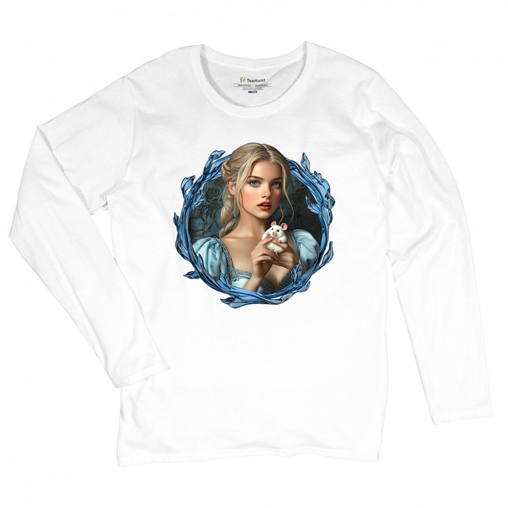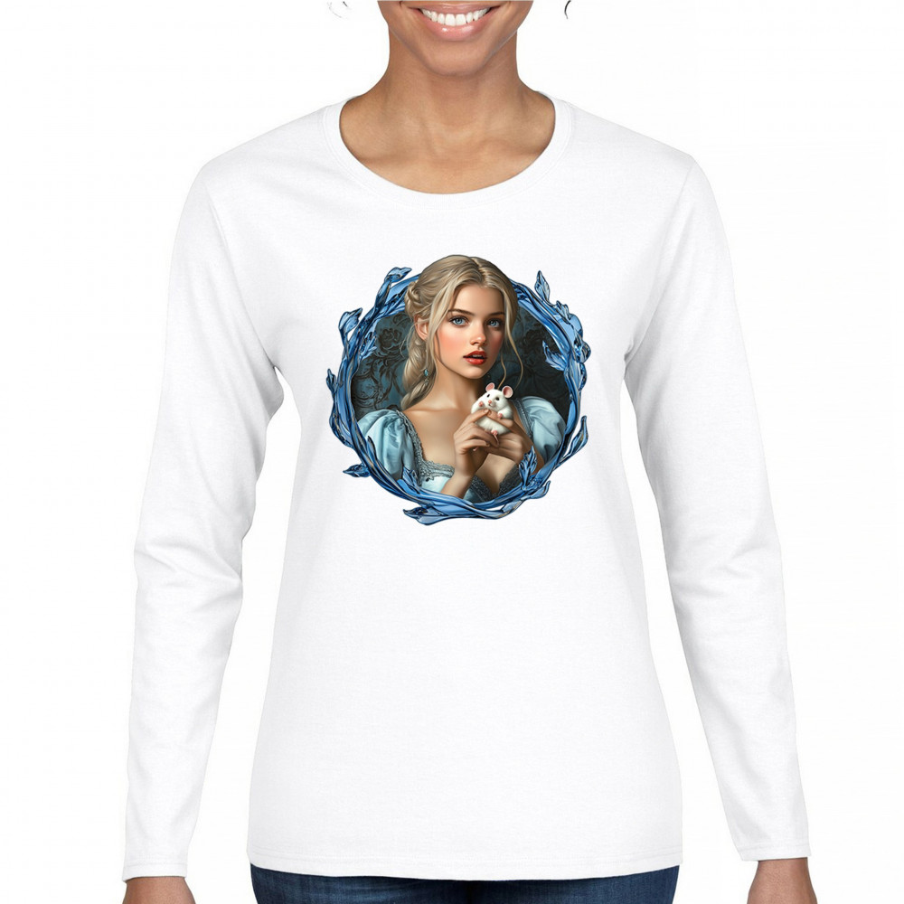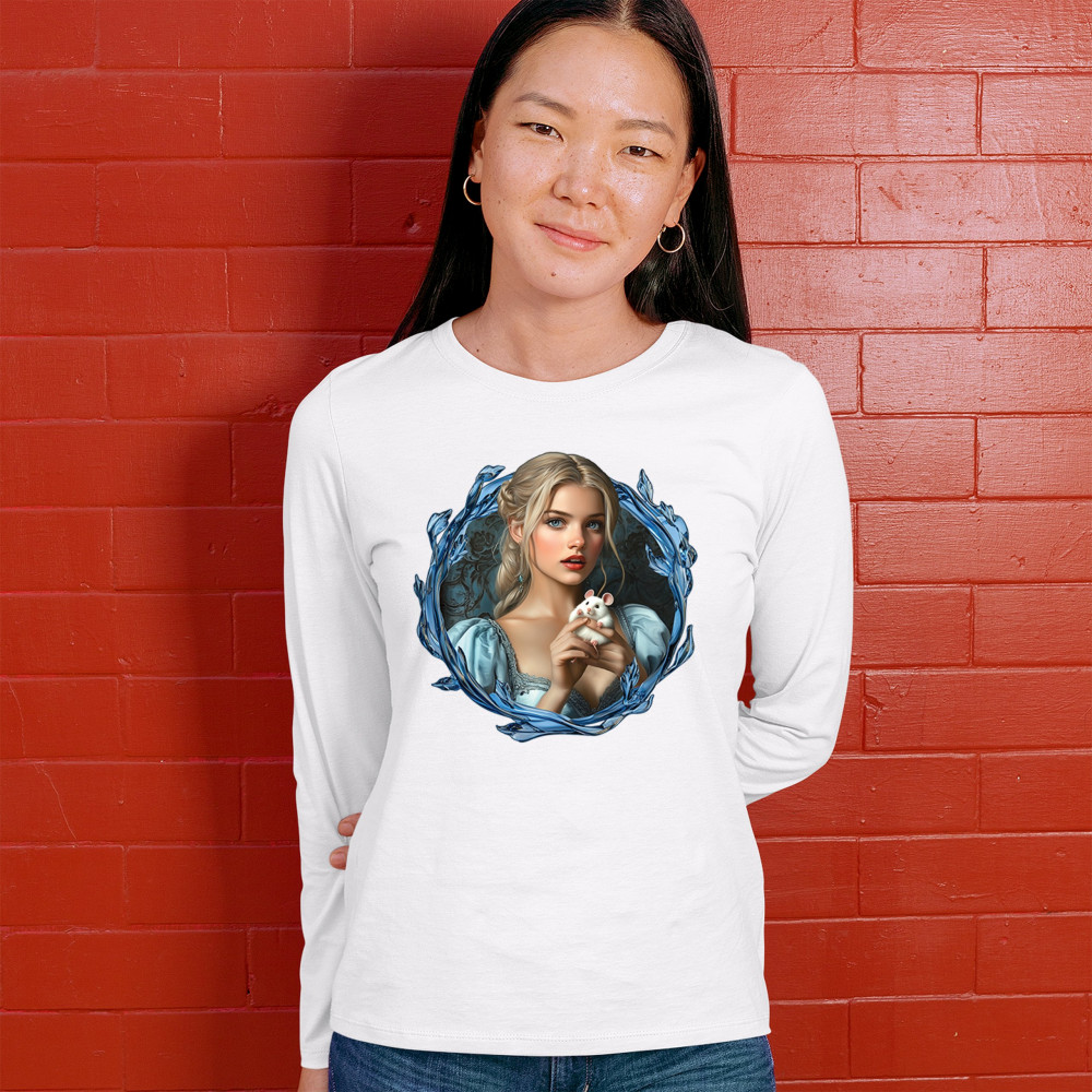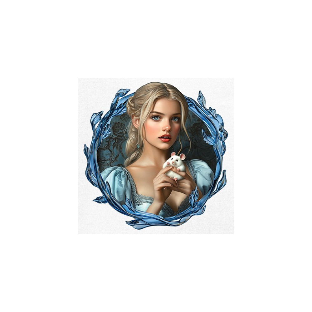 A whimsical design inspired by fairytales and Cinderella magic, featuring a blonde girl in a blue dress holding a white mouse. The icy blue leaf frame evokes enchantment and transformation. With soft, vintage tones and a dreamy feel, it’s a charming tribute to kindness, fantasy, animal companionship, and gentle storytelling magic.