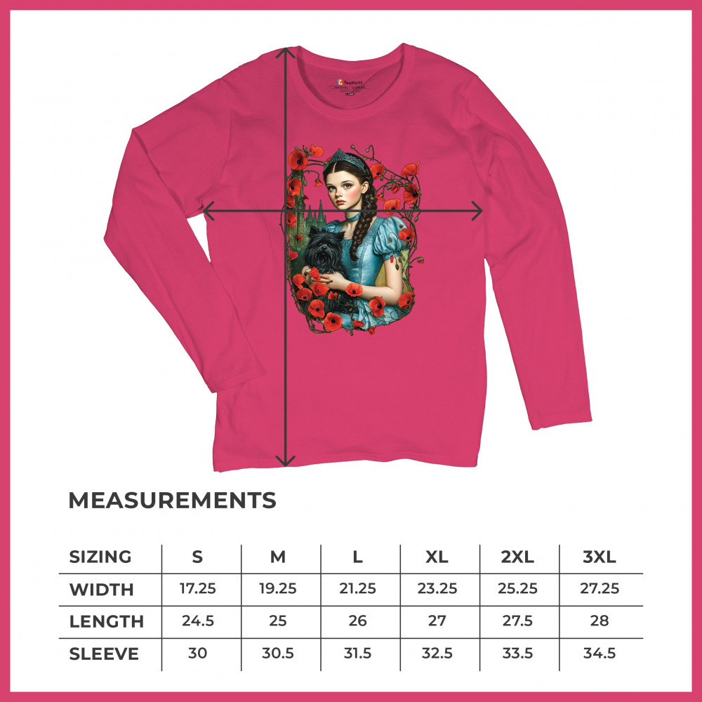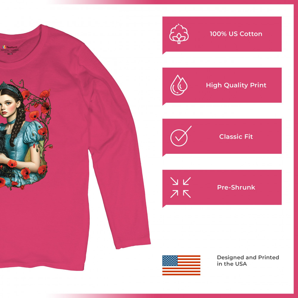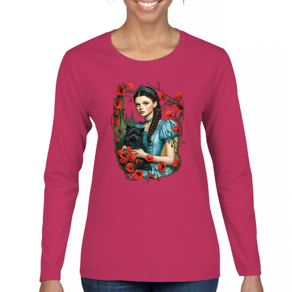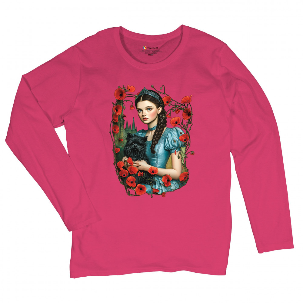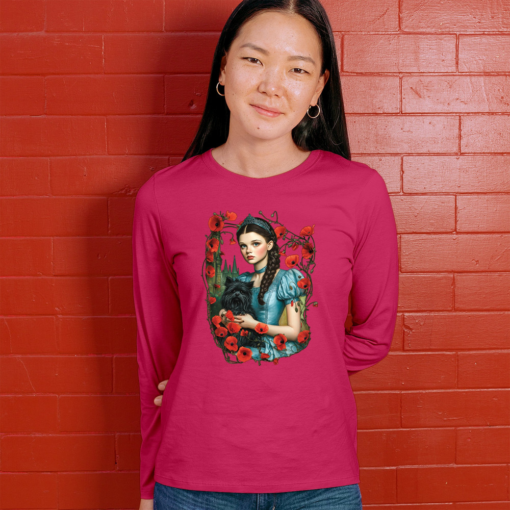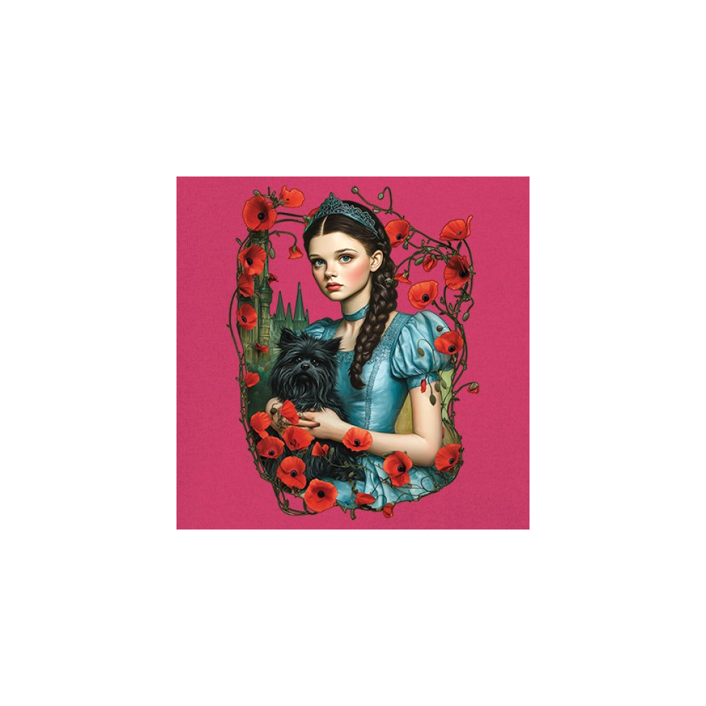 A charming design inspired by dark fairytales, featuring a girl in a blue dress holding her black dog amidst blooming red poppies. A distant castle and vintage styling channel Wizard of Oz fantasy with a gothic twist. Ideal for dreamers, nostalgic collectors, and lovers of whimsical storybook art filled with magic and memory.