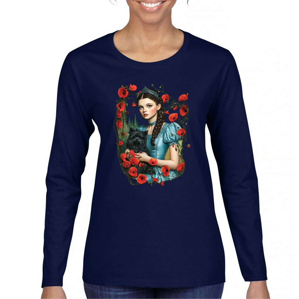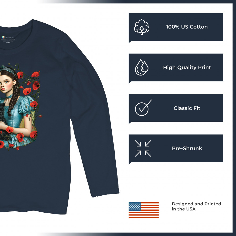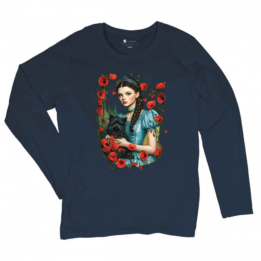 A charming design inspired by dark fairytales, featuring a girl in a blue dress holding her black dog amidst blooming red poppies. A distant castle and vintage styling channel Wizard of Oz fantasy with a gothic twist. Ideal for dreamers, nostalgic collectors, and lovers of whimsical storybook art filled with magic and memory.