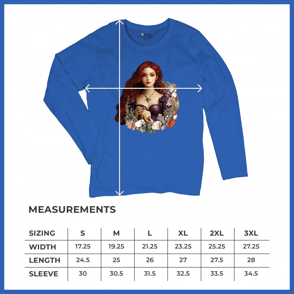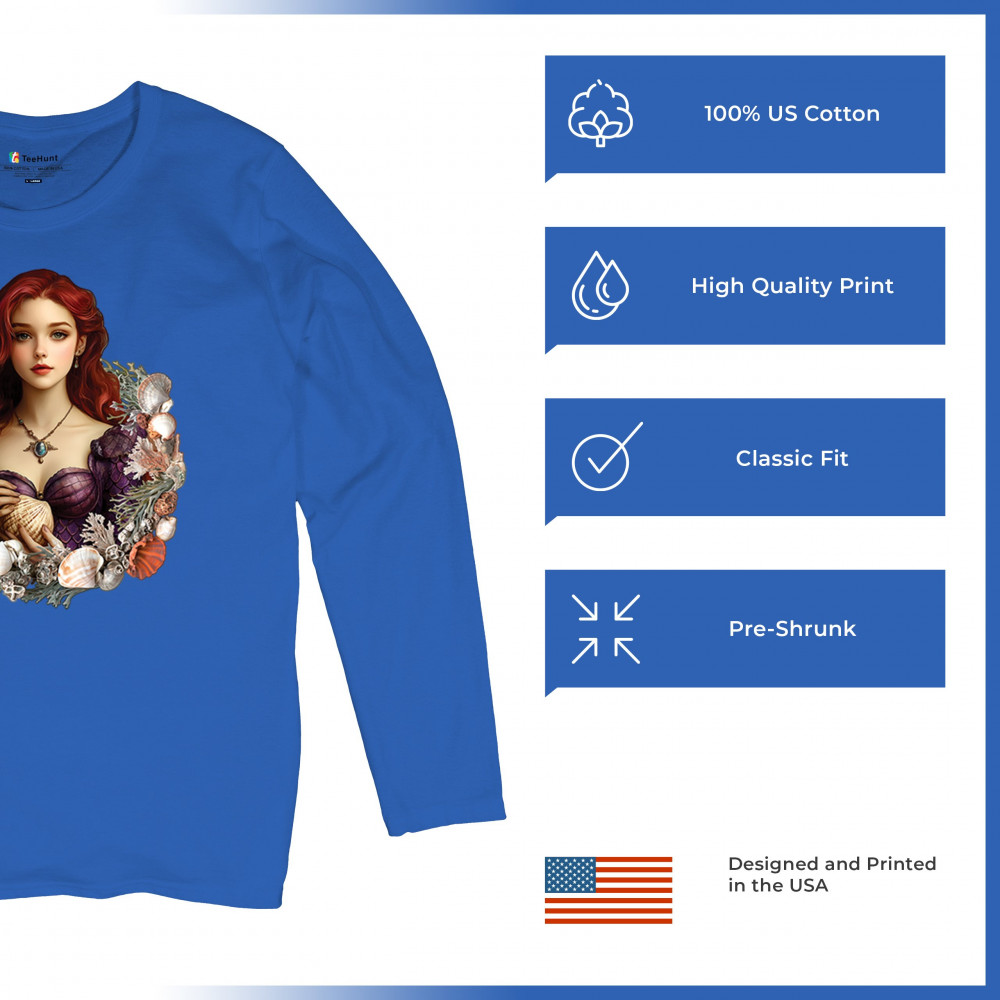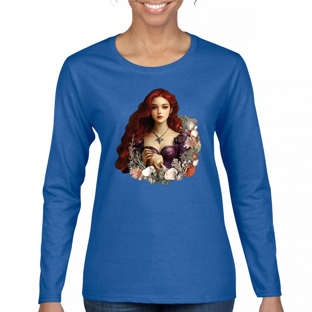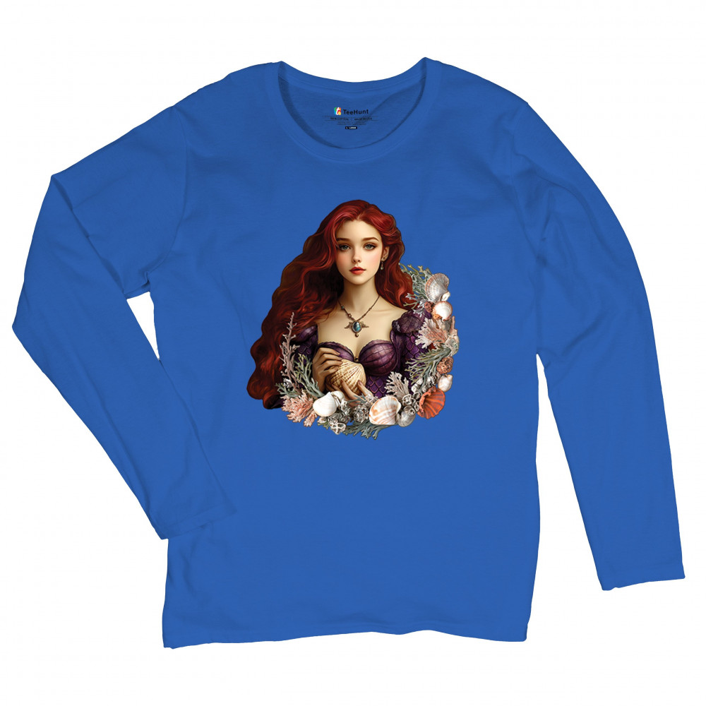 Inspired by mystical ocean themes, this design features a fantasy red-haired girl in a seashell dress, cradling a large shell. She is framed by coral, seaweed, and a shimmering array of ocean shells. With nods to classic mermaid lore and fairytale storytelling, it's perfect for fans of fantasy creatures, marine magic, and romantic ocean legends.