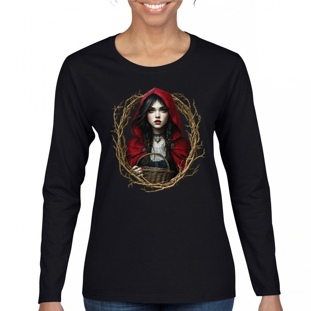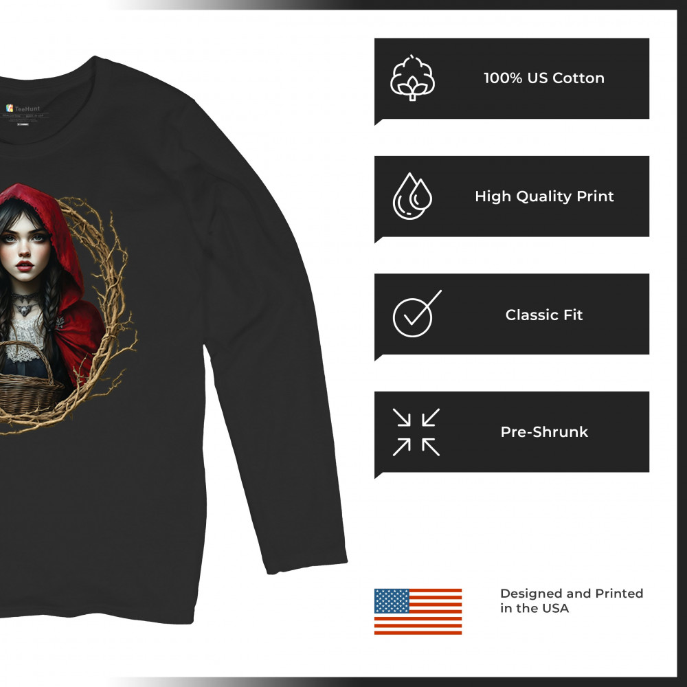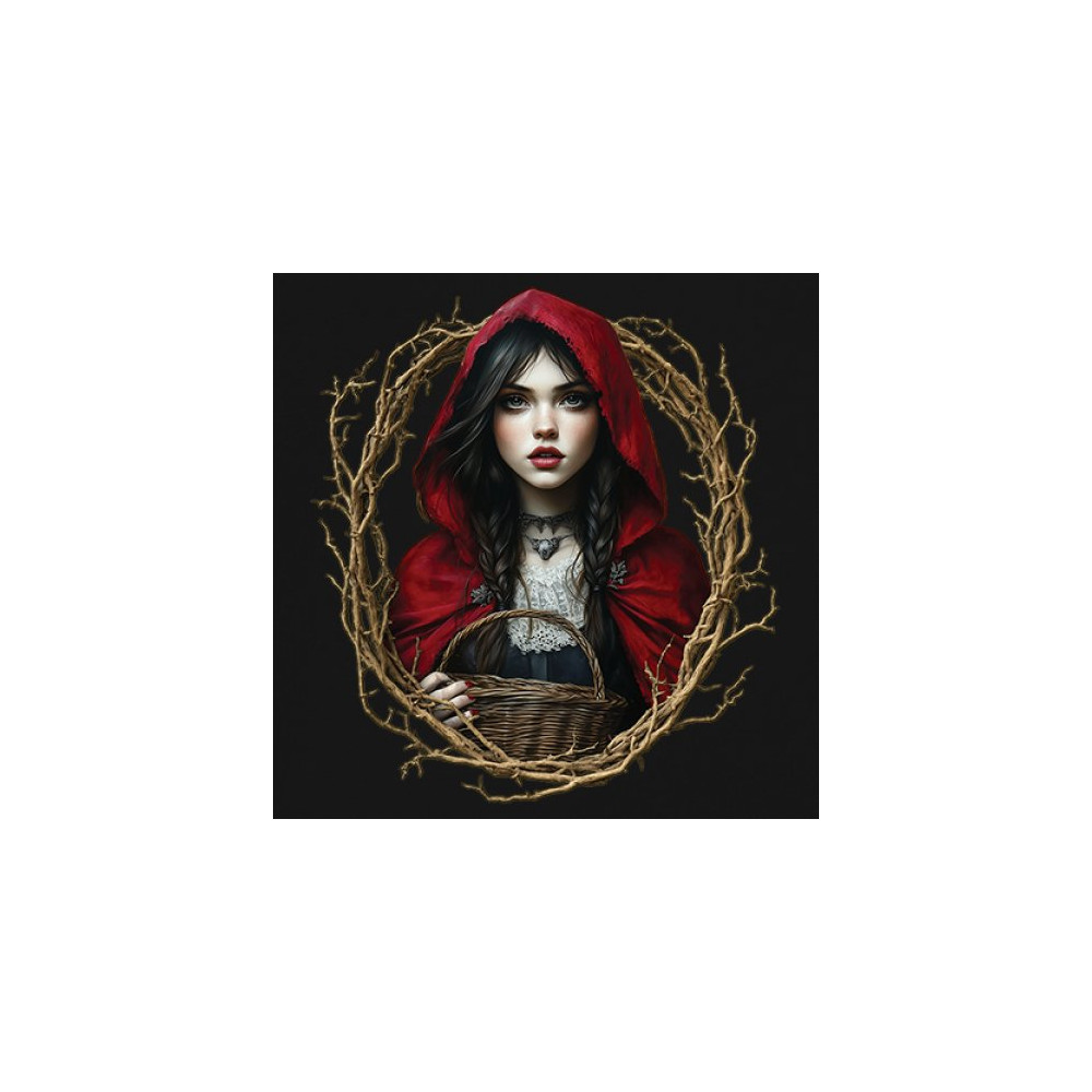 Step into a shadowy fairytale with this gothic design featuring a red-cloaked girl and twisted forest branches. Evoking themes from Red Riding Hood and folklore magic, it’s rich in fantasy, mystery, and dark aesthetic. Perfect for fantasy lovers, dark romantics, and storybook dreamers drawn to enchanted paths and eerie tales.