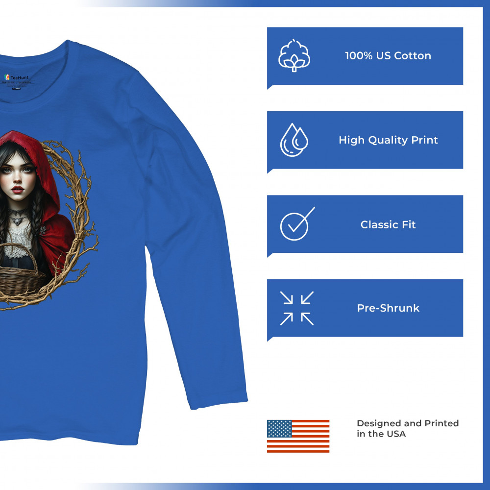 Step into a shadowy fairytale with this gothic design featuring a red-cloaked girl and twisted forest branches. Evoking themes from Red Riding Hood and folklore magic, it’s rich in fantasy, mystery, and dark aesthetic. Perfect for fantasy lovers, dark romantics, and storybook dreamers drawn to enchanted paths and eerie tales.