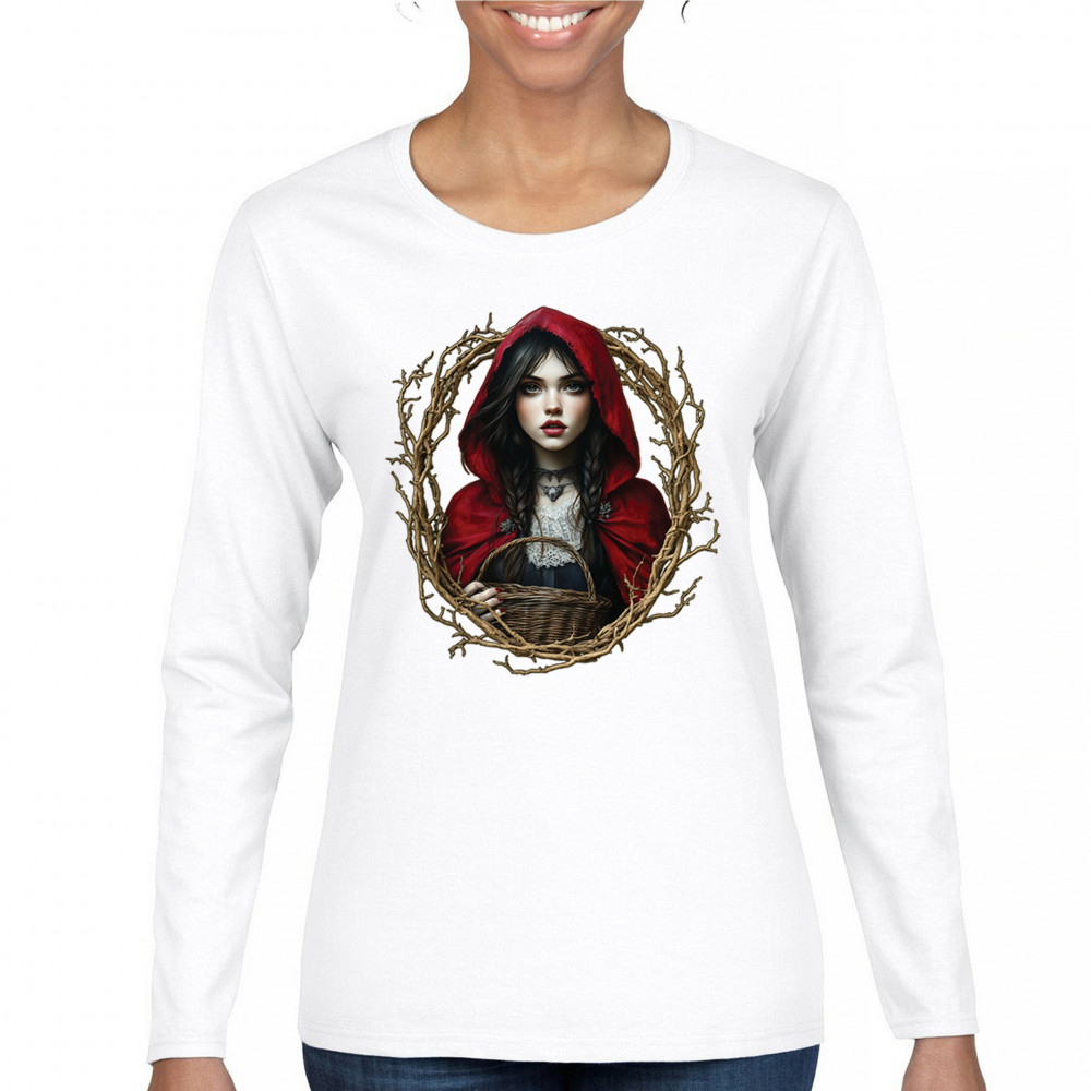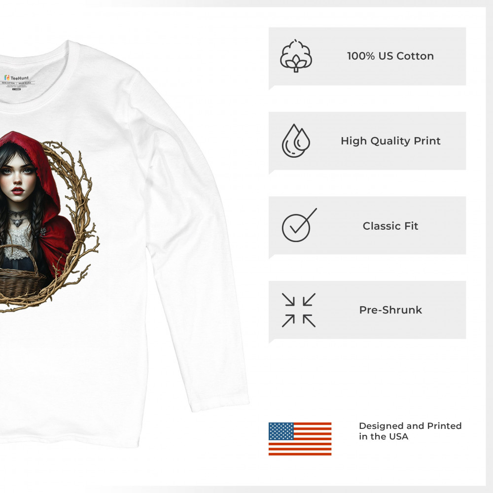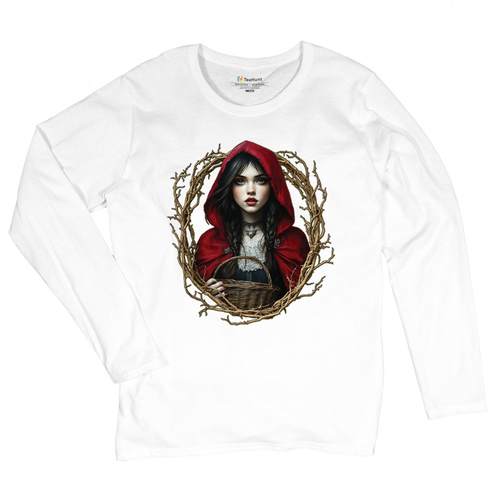 Step into a shadowy fairytale with this gothic design featuring a red-cloaked girl and twisted forest branches. Evoking themes from Red Riding Hood and folklore magic, it’s rich in fantasy, mystery, and dark aesthetic. Perfect for fantasy lovers, dark romantics, and storybook dreamers drawn to enchanted paths and eerie tales.
