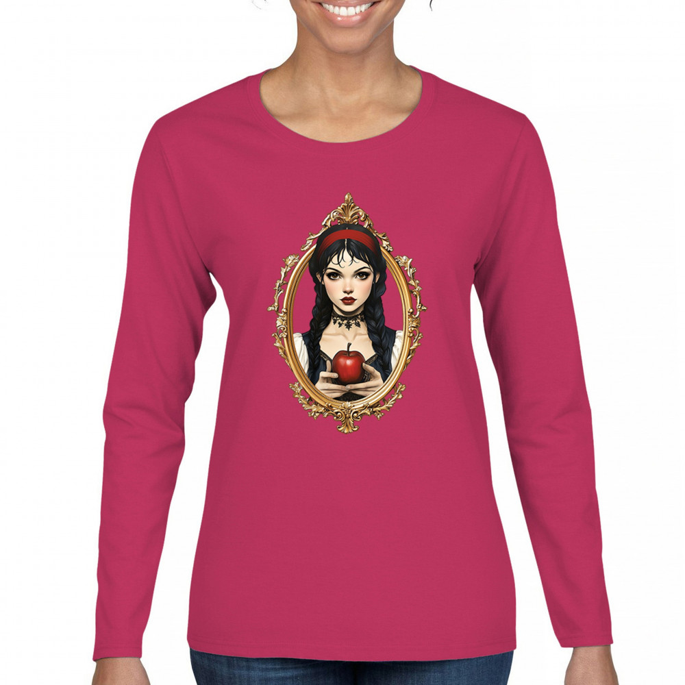 Dark fairytale design with red apple, gold frame, and Snow White vibes. A dreamy blend of fantasy, gothic style, and magical storytelling.