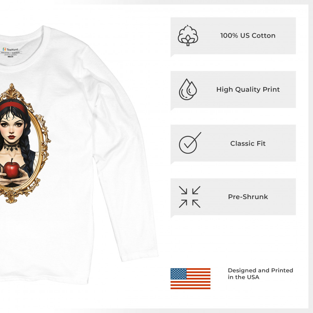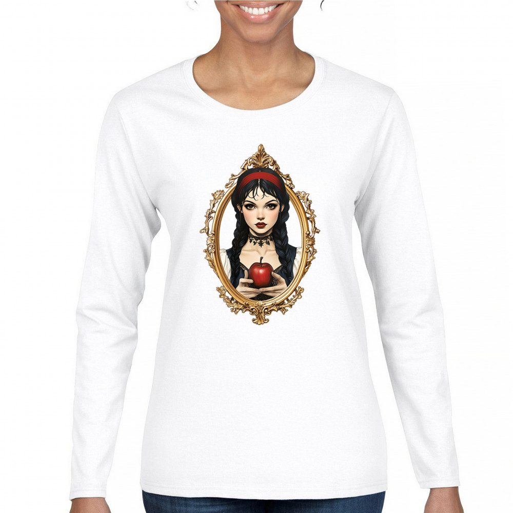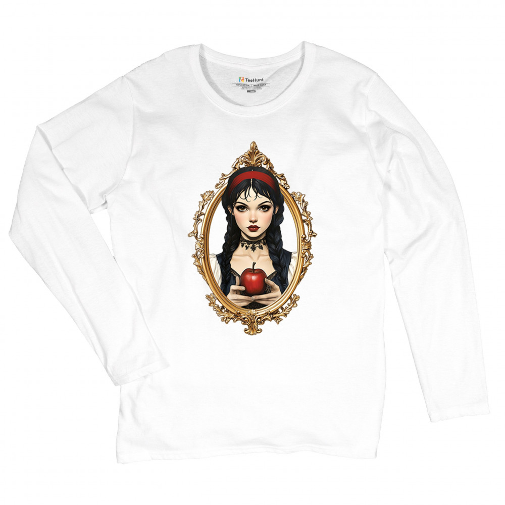 Dark fairytale design with red apple, gold frame, and Snow White vibes. A dreamy blend of fantasy, gothic style, and magical storytelling.