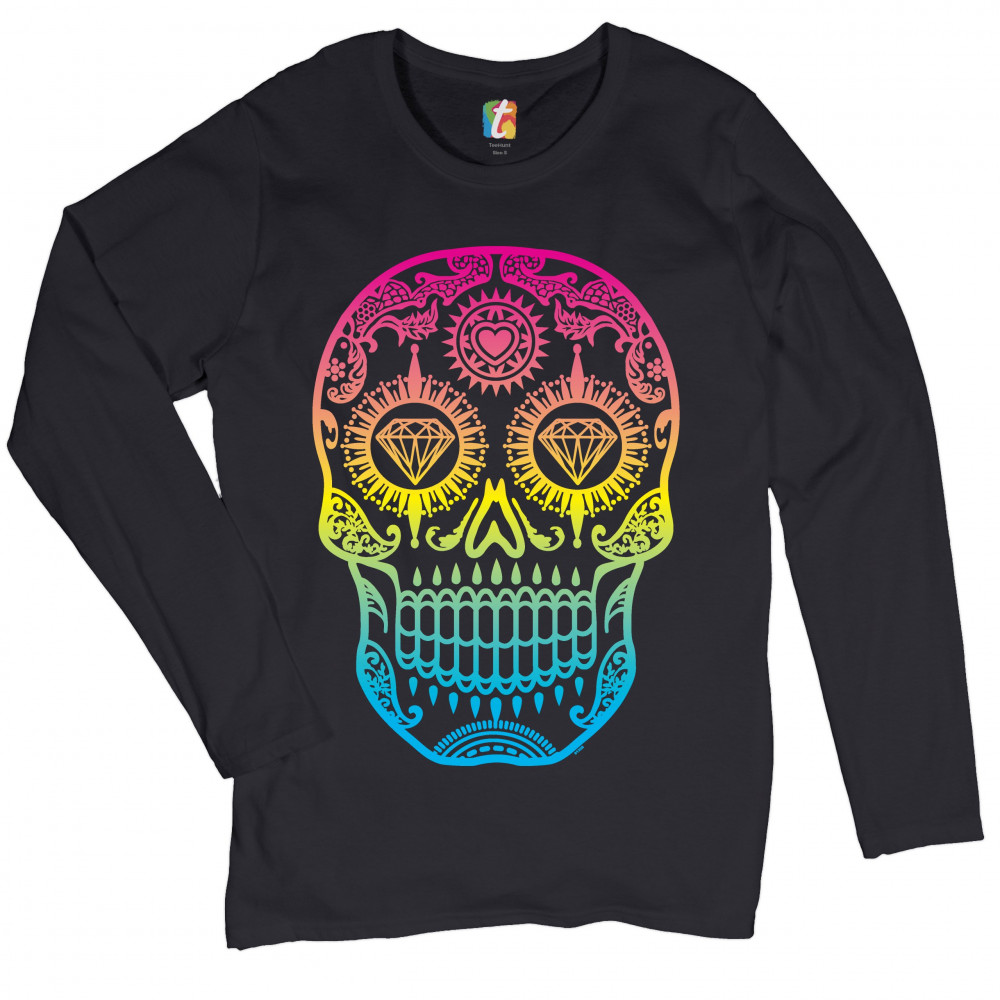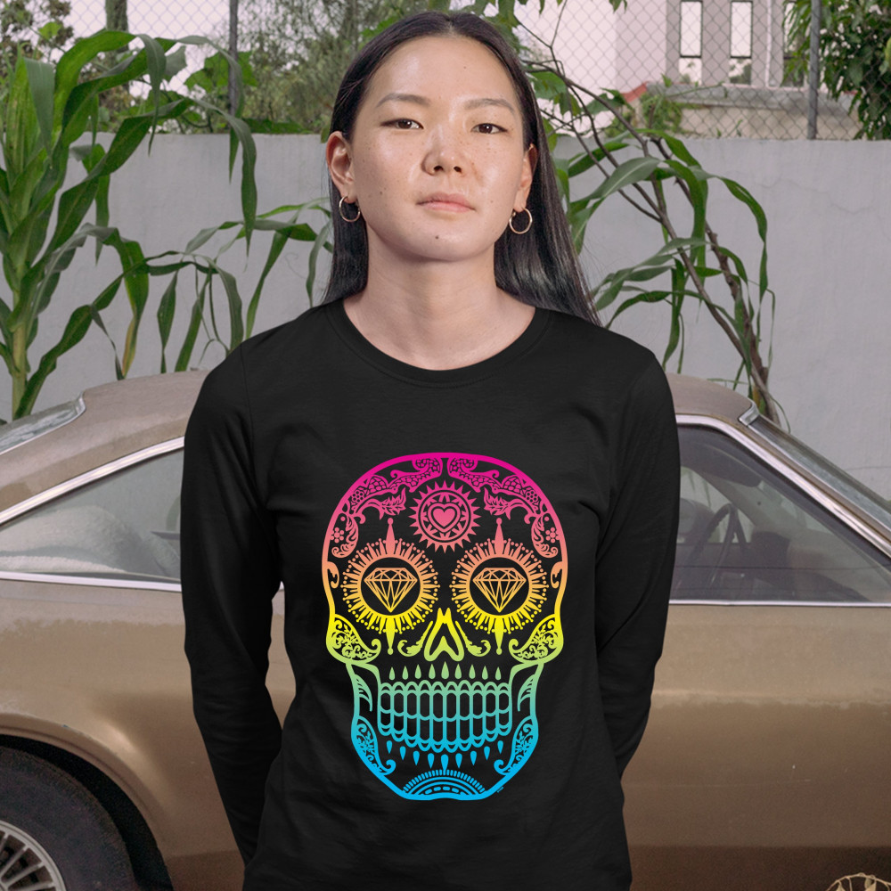 SUGAR SKULL CALAVERA DIAMOND EYES women's long sleeve t-shirt day of the dead black