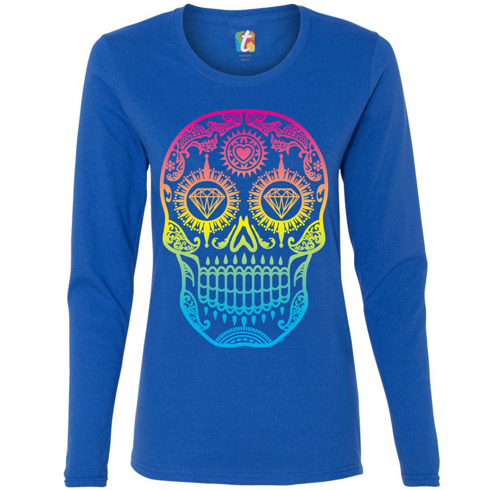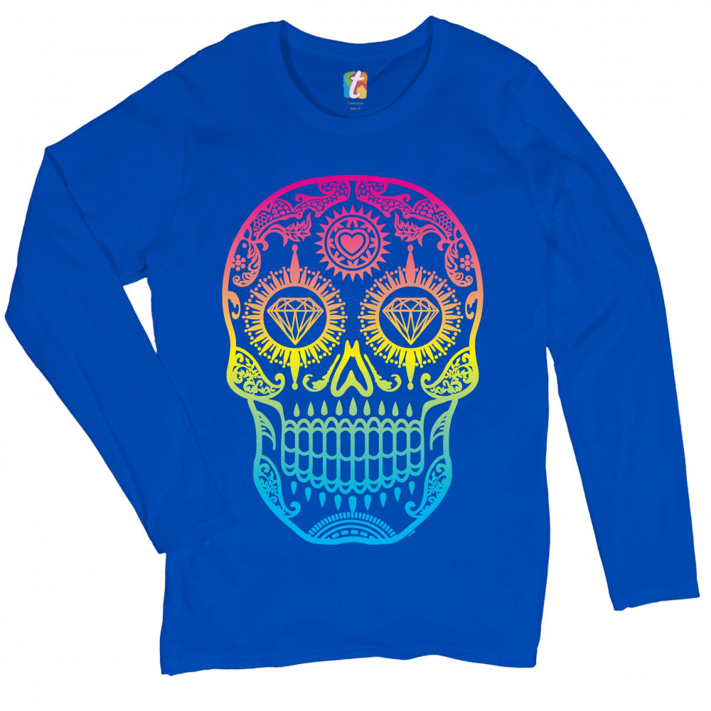 SUGAR SKULL CALAVERA DIAMOND EYES women's long sleeve t-shirt day of the dead royal blue