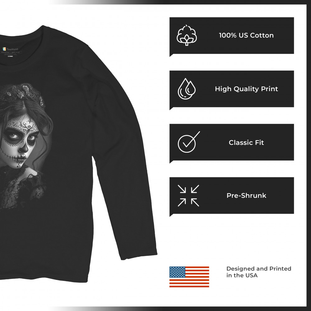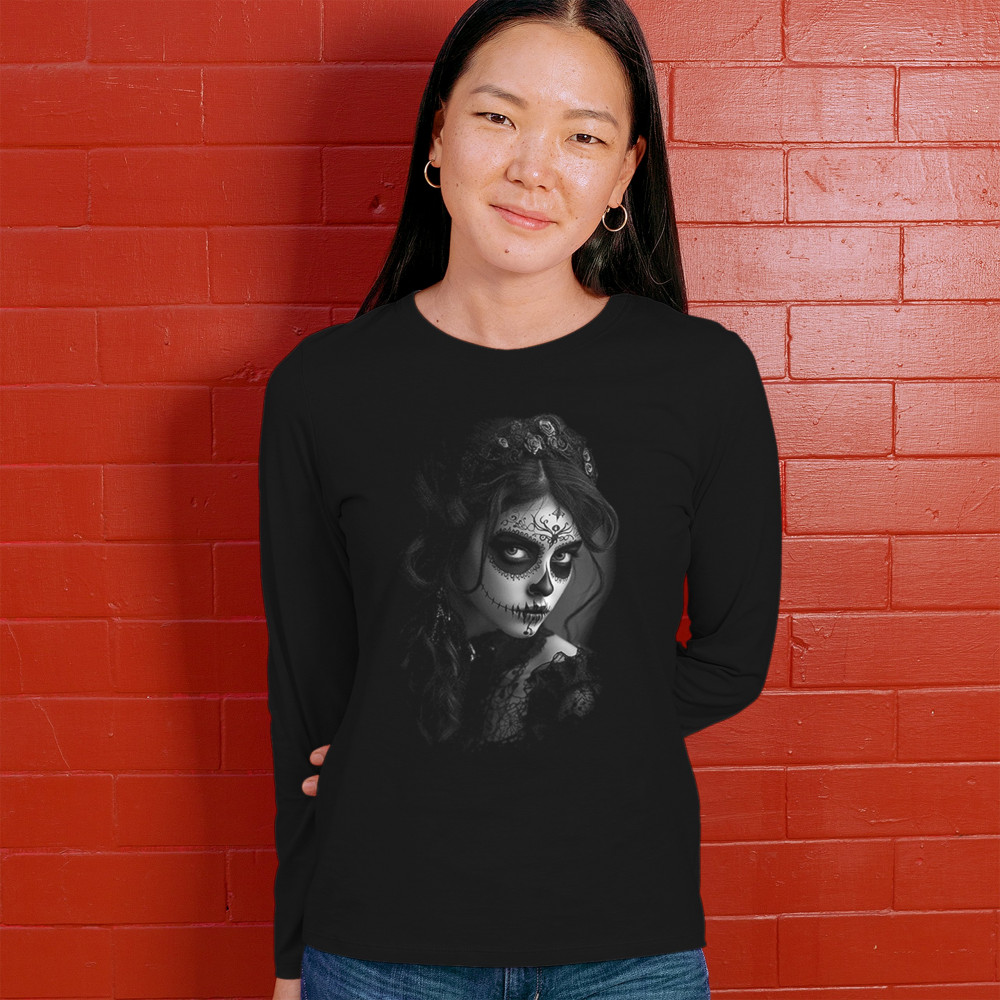 Showcasing a gothic woman with a sugar skull face, this black-and-white design blends DÃa de los Muertos tradition with dark elegance. Intricate face makeup, detailed lace, and a bold monochrome aesthetic create a dramatic visual tribute. A perfect piece for lovers of skull motifs, alt style, and haunting beauty.