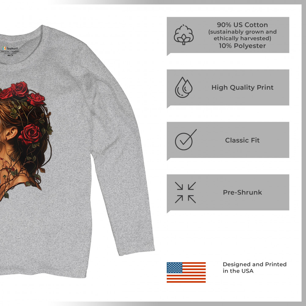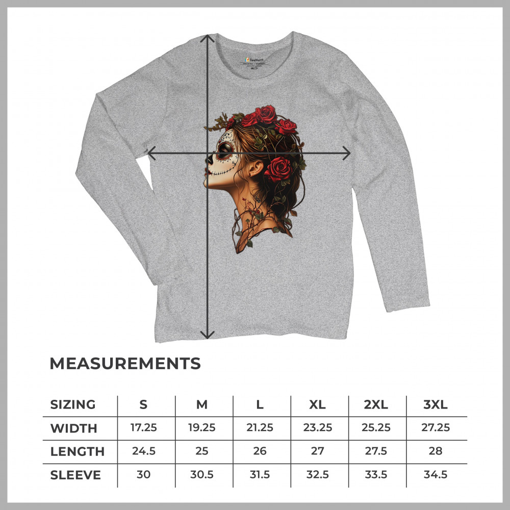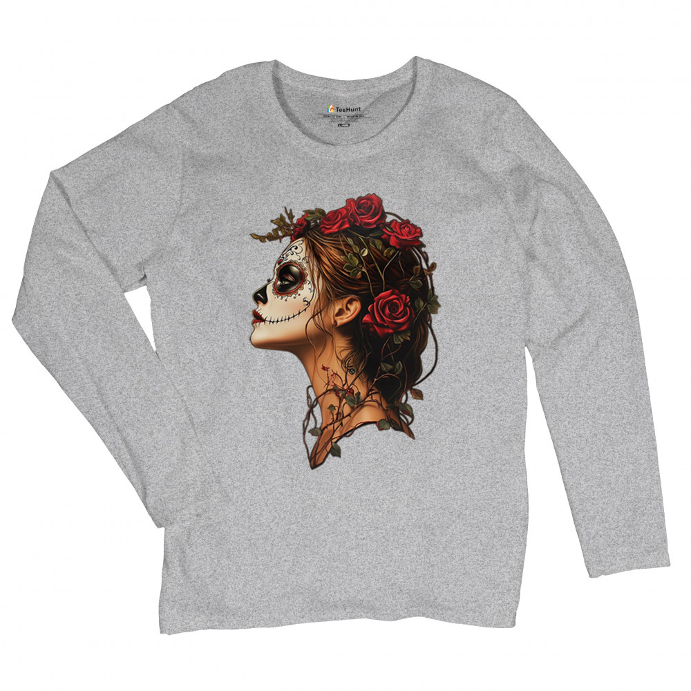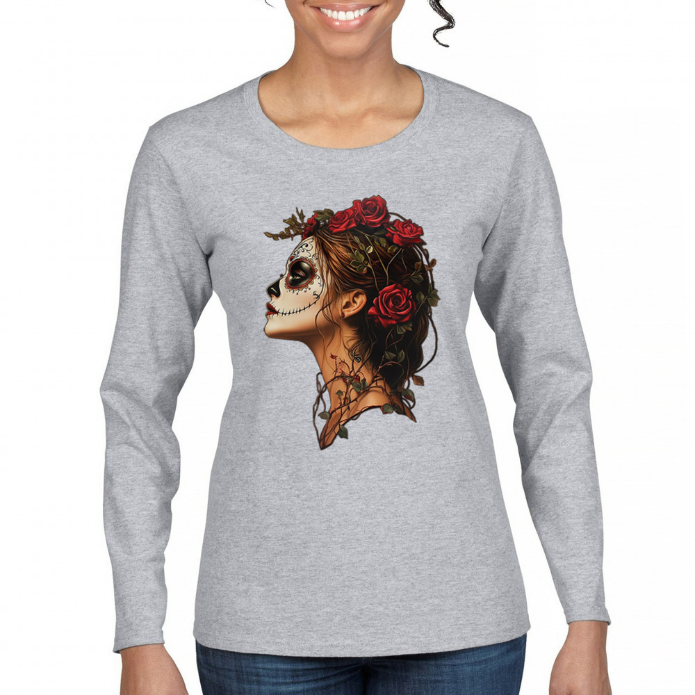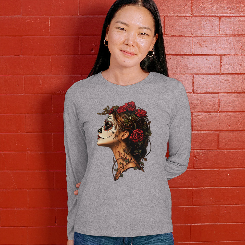 Celebrate feminine power and gothic elegance with this captivating DÃa de los Muertos design. Featuring a woman in profile with sugar skull makeup, blooming red roses, natural vines, dark hair, and symbolic floral skull art, this bold tribute captures beauty, death, and strength in one romantic, detailed visual.