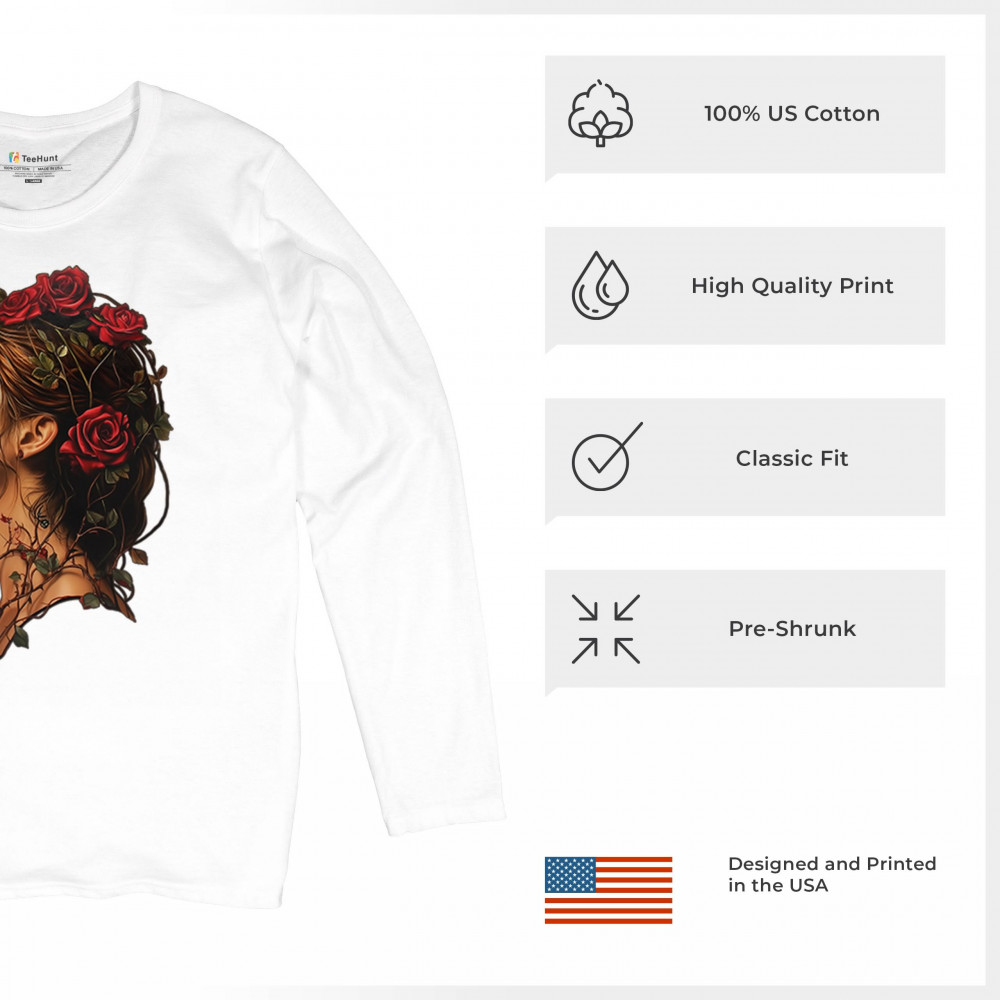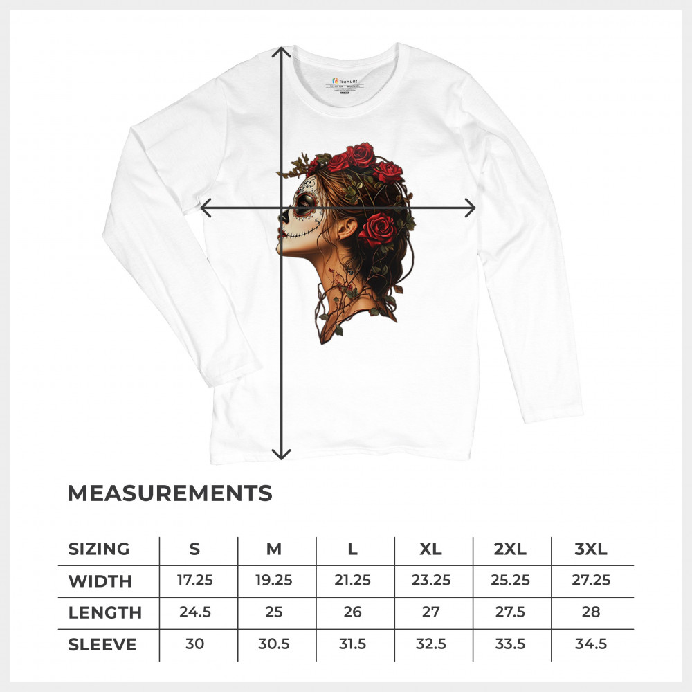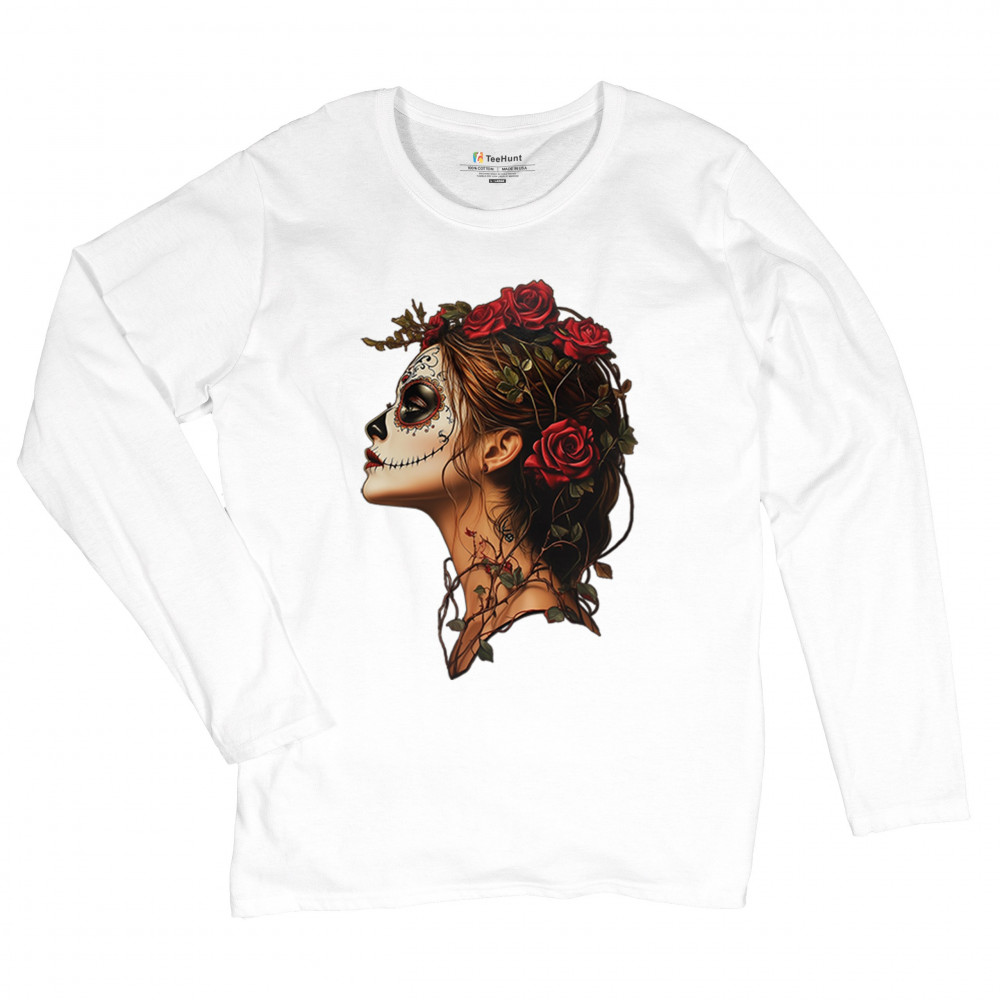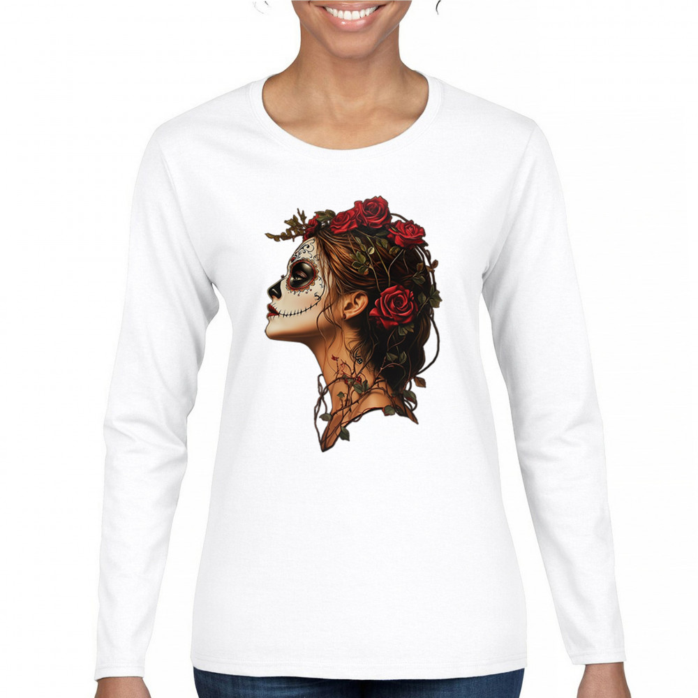 Celebrate feminine power and gothic elegance with this captivating DÃa de los Muertos design. Featuring a woman in profile with sugar skull makeup, blooming red roses, natural vines, dark hair, and symbolic floral skull art, this bold tribute captures beauty, death, and strength in one romantic, detailed visual.