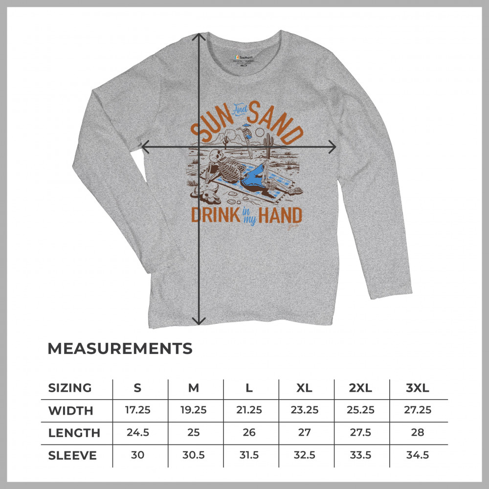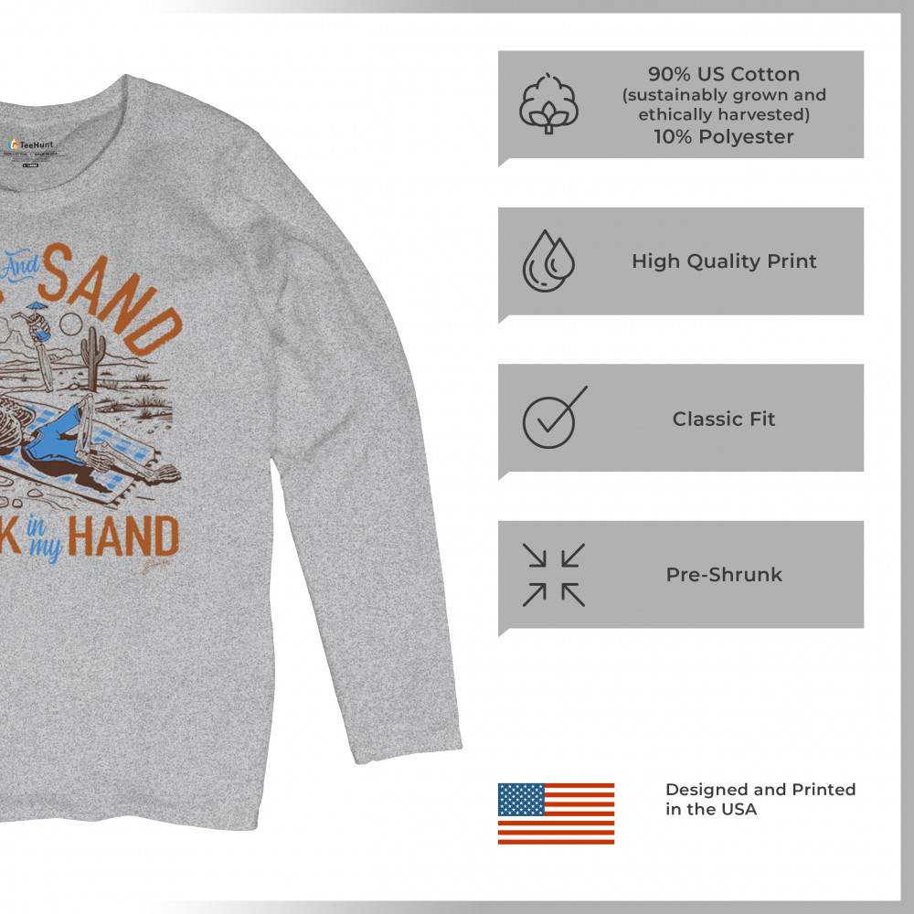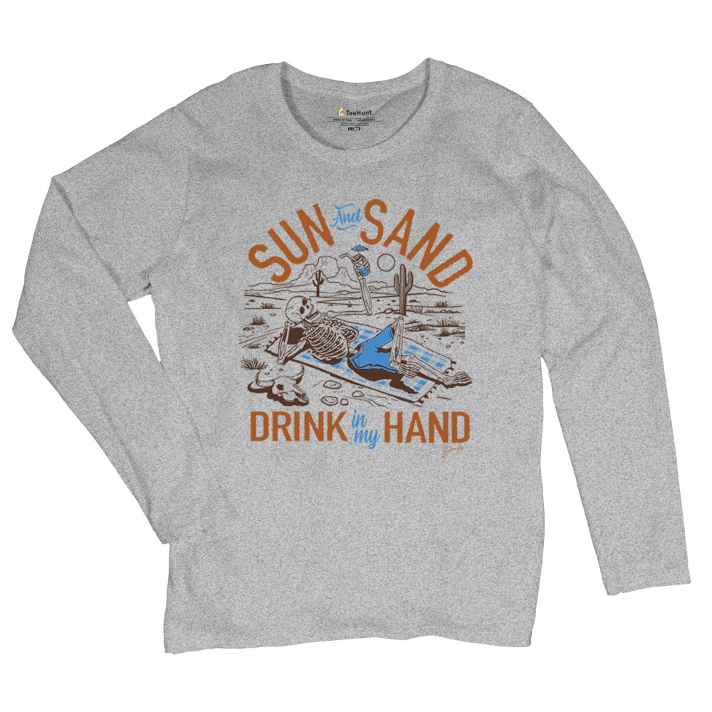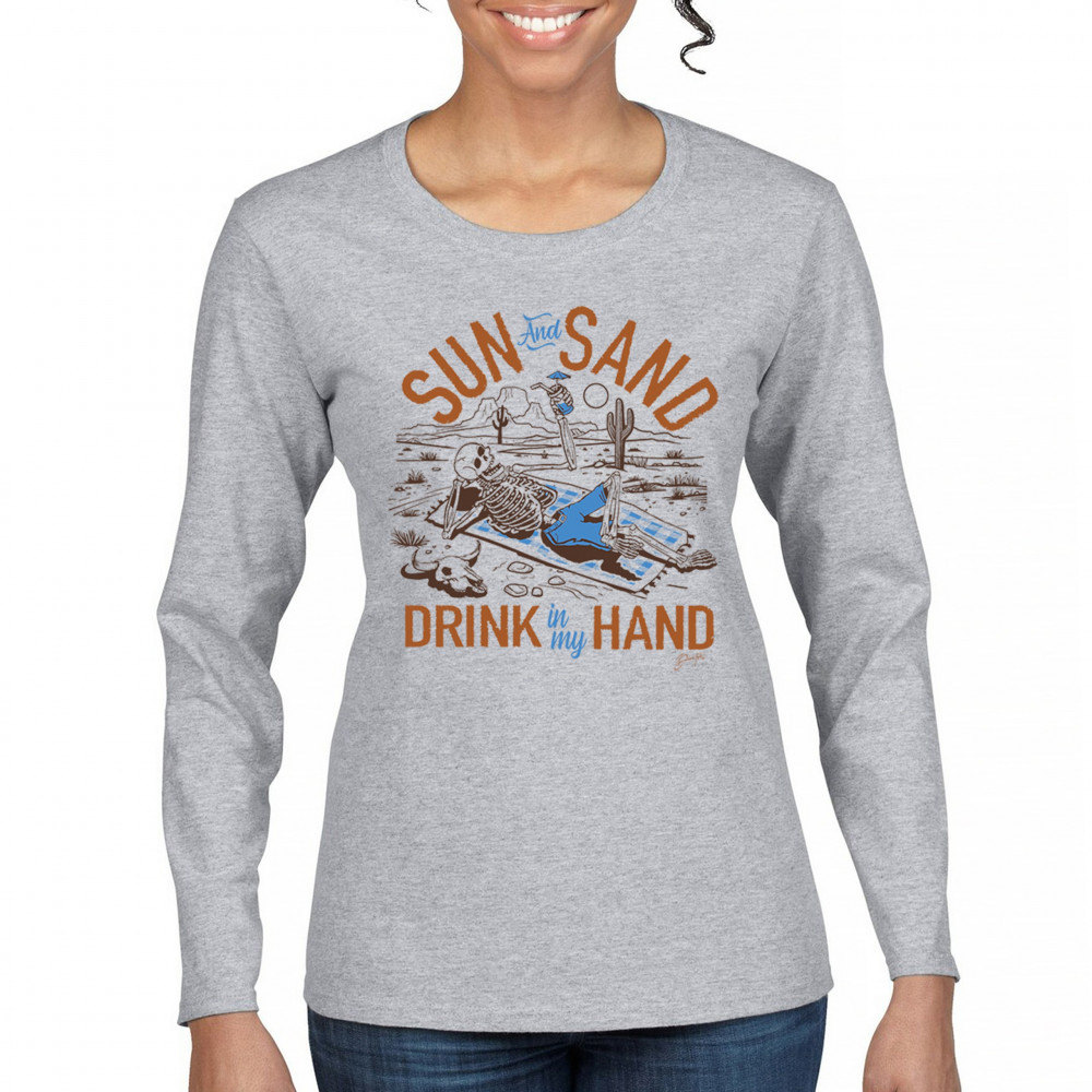 SUN AND SAND DRINK IN MY HAND women's long sleeve t-shirt funny dry heat desert gray