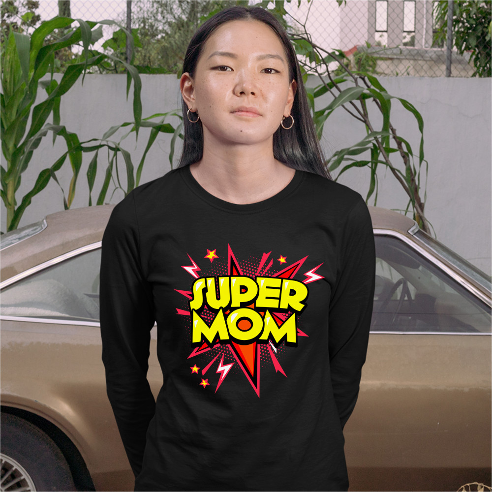 A bright print that says "super mom". Behind the words there is a cartoonish explosion with stars and lightnings flying everywhere. A great choice as a gift on Mother's Day for a loving caring mom.