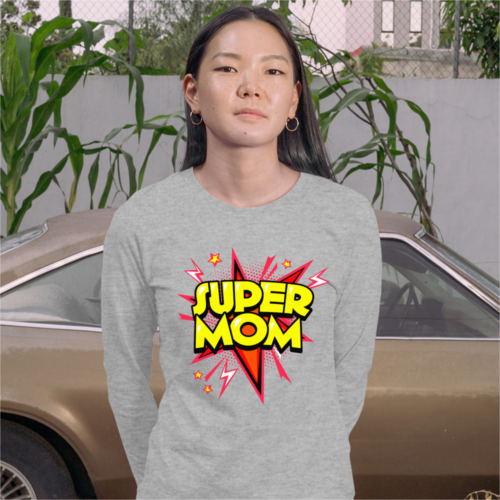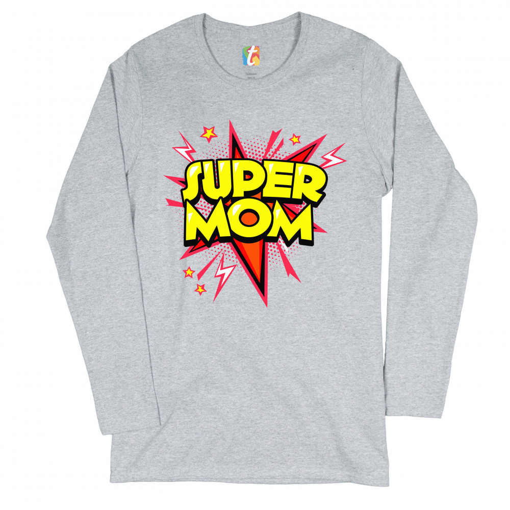 SUPER MOM women's long sleeve t-shirt mother's day funny parody superhero mama gray