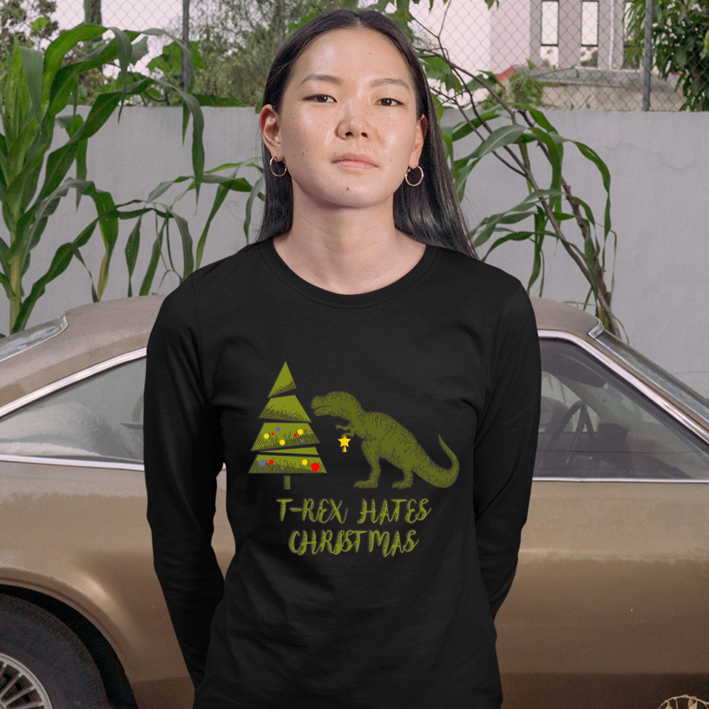 T-REX HATES CHRISTMAS women's long sleeve t-shirt funny dinosaur xmas festive black