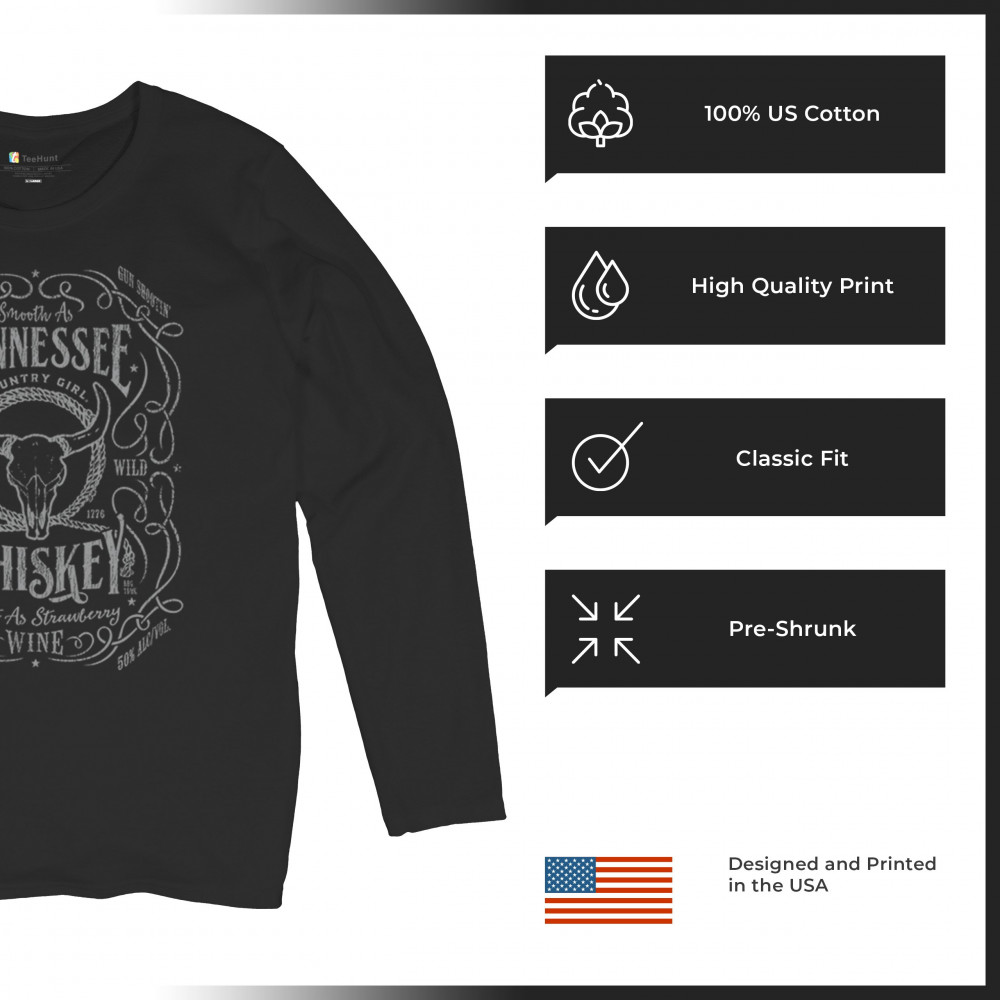 Smooth As Tennessee Whiskey, Sweet As Strawberry Wine. This country girl design delivers retro charm with bold lettering, a vintage bull skull, and classic southern pride. Perfect for cowgirls who love dirt roads, music festivals, rodeos, or a night of whiskey and wine under the stars.