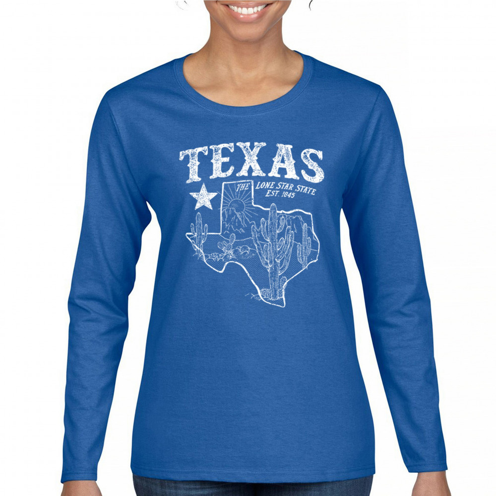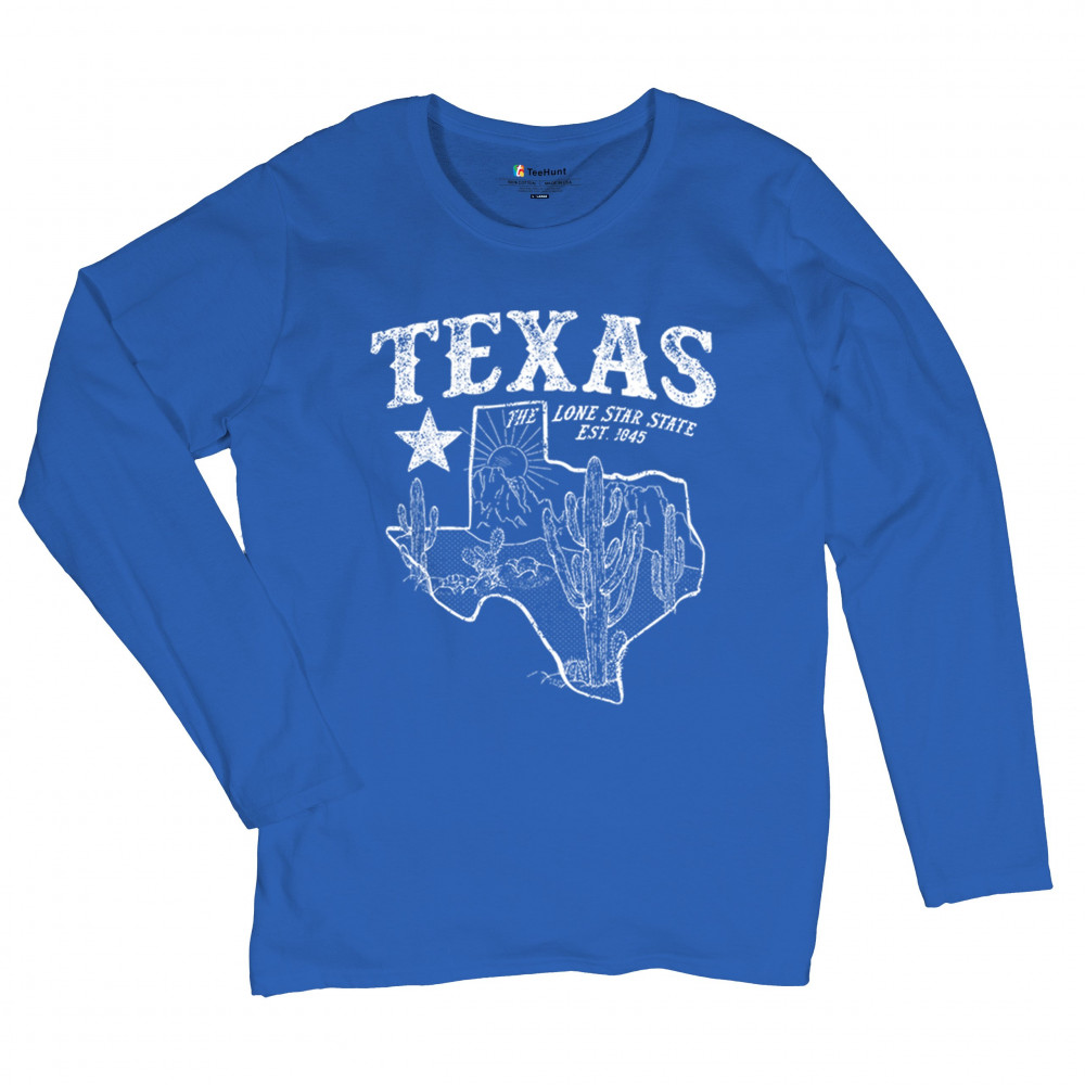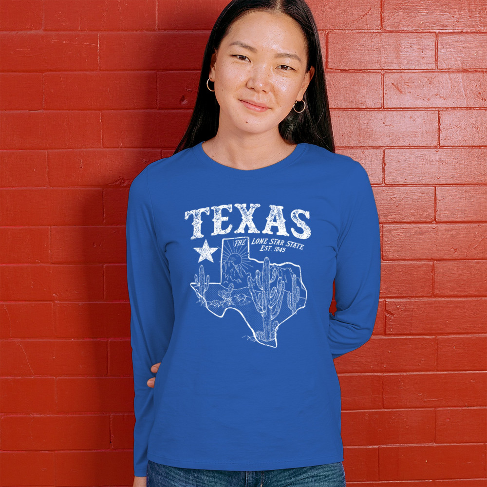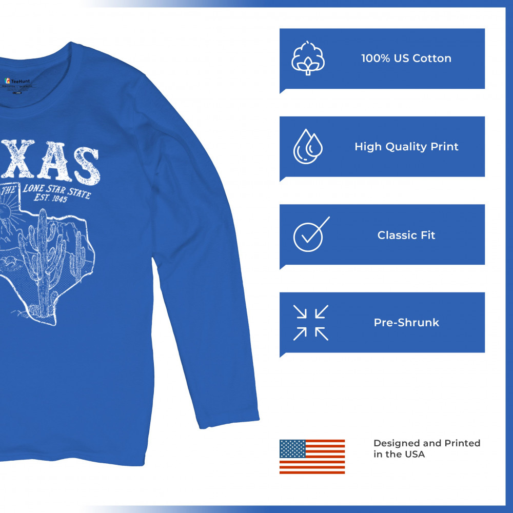 Vintage Texas pride design with cactus, mountains, Lone Star symbol, and 1845 tribute—perfect for rodeos and western events.
