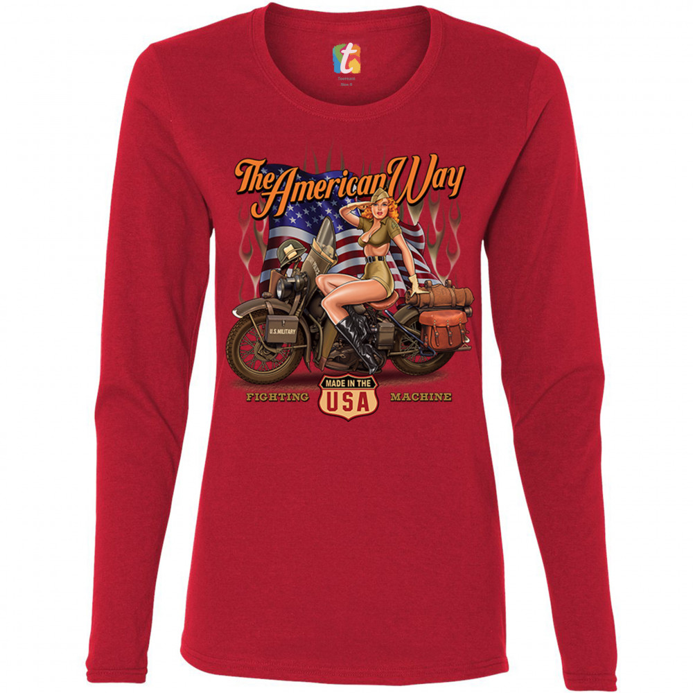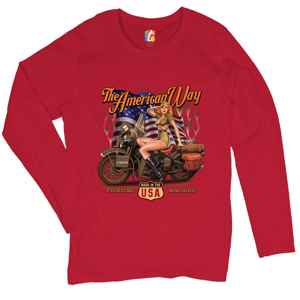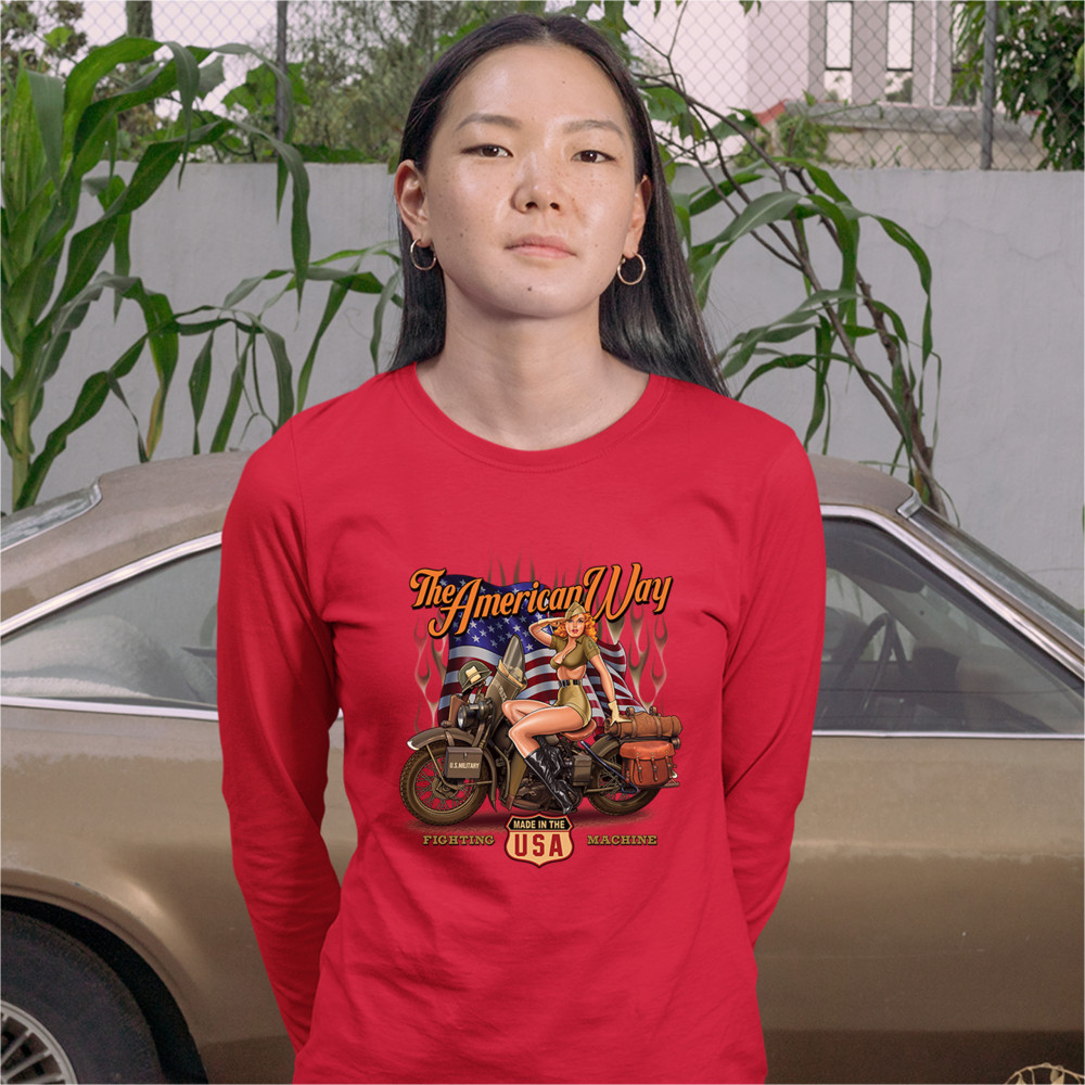 A print featuring a beautiful pin-up girl in leather boots sitting on a U.S. military motorcycle. There is the American Flag in the background and the words "The American Way" above it. At the bottom of the picture there is a shield which says: "made in the USA". "Fighting Machine" is written under the motorcycle's wheels. A great choice for a motorcycle enthusiast.