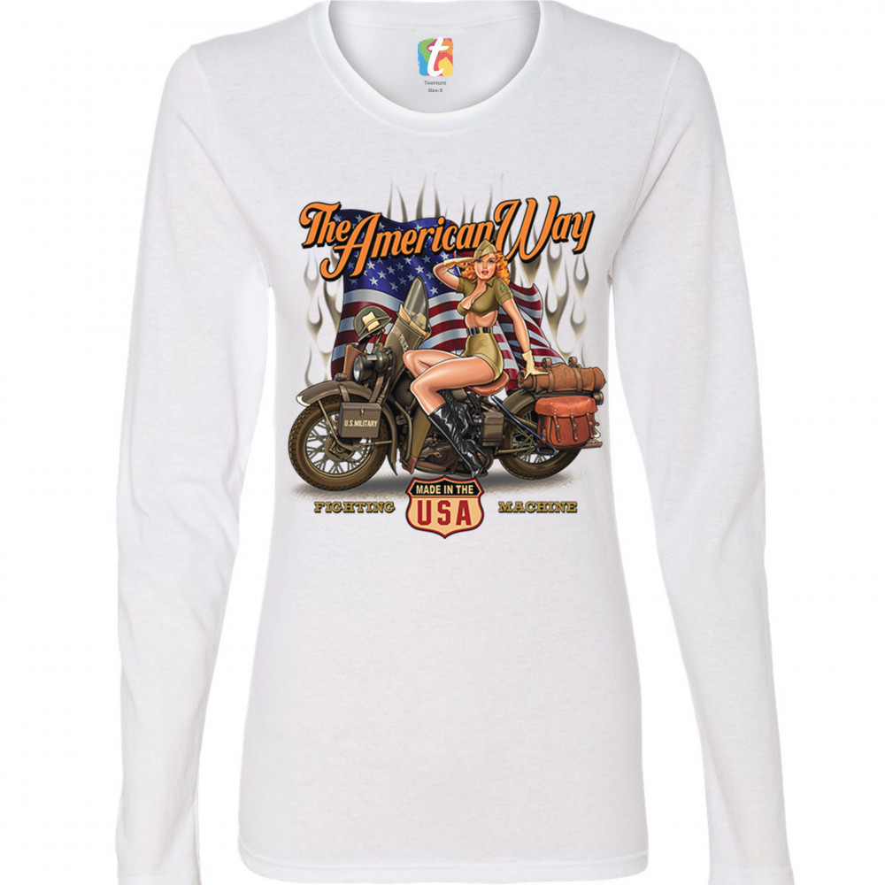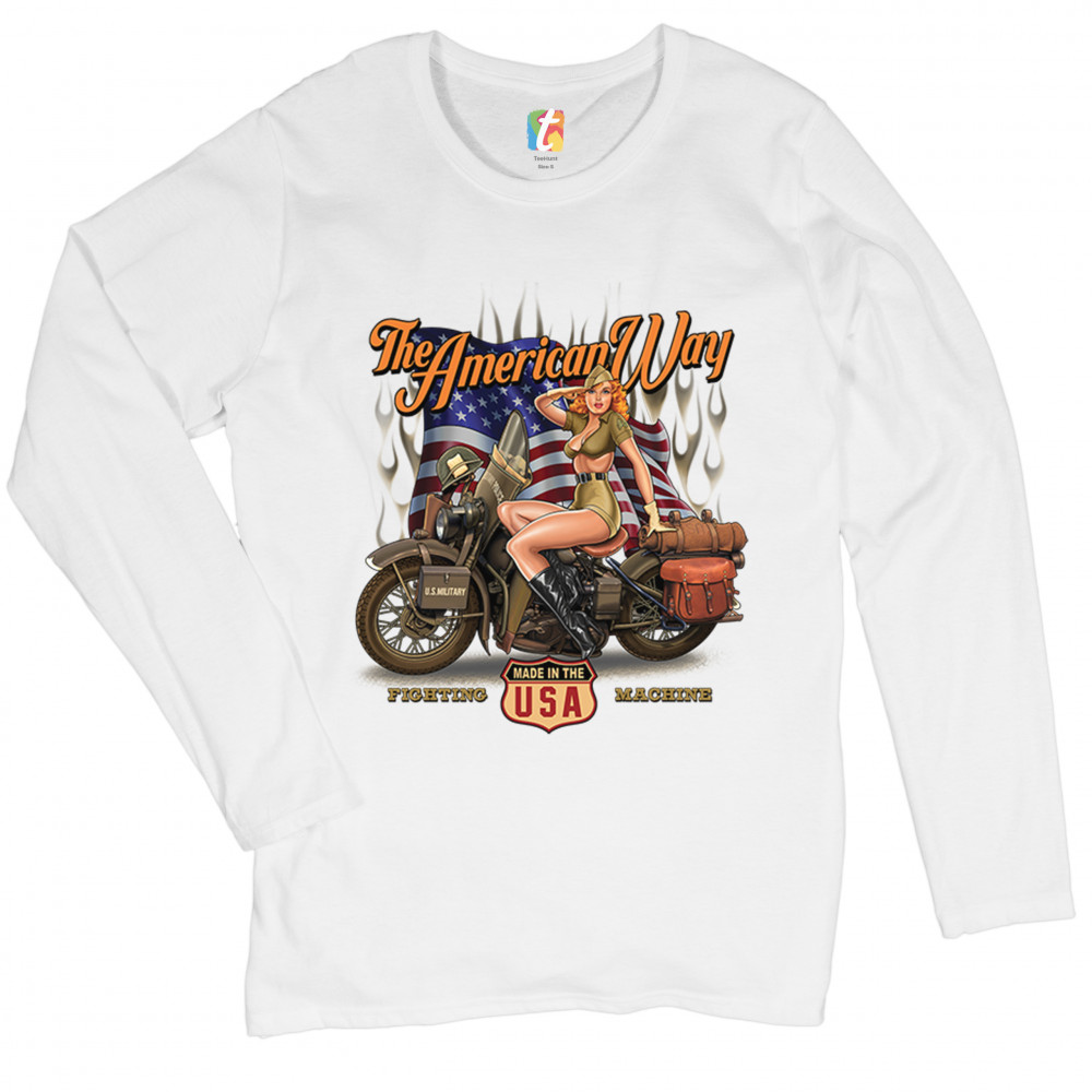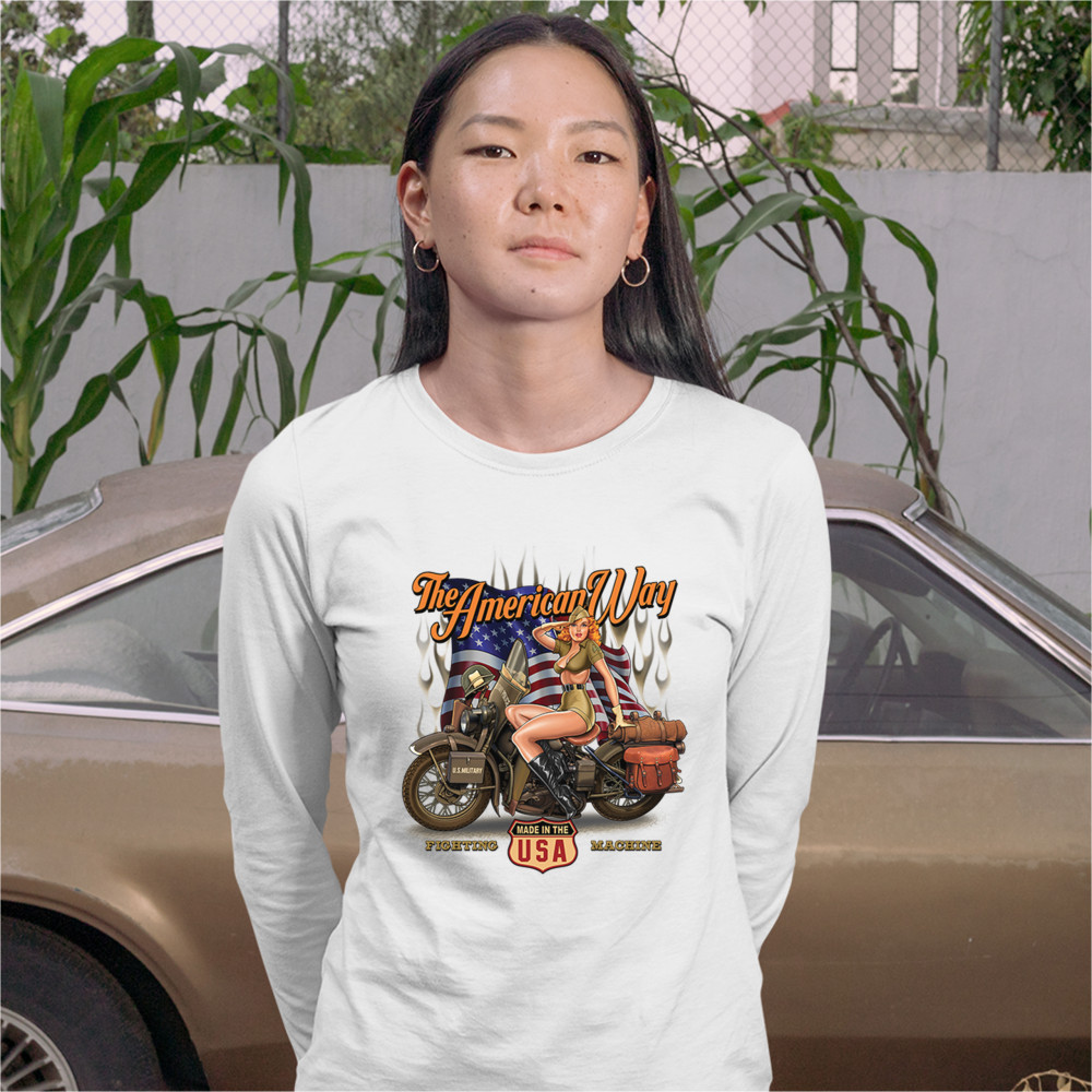 A print featuring a beautiful pin-up girl in leather boots sitting on a U.S. military motorcycle. There is the American Flag in the background and the words "The American Way" above it. At the bottom of the picture there is a shield which says: "made in the USA". "Fighting Machine" is written under the motorcycle's wheels. A great choice for a motorcycle enthusiast.
