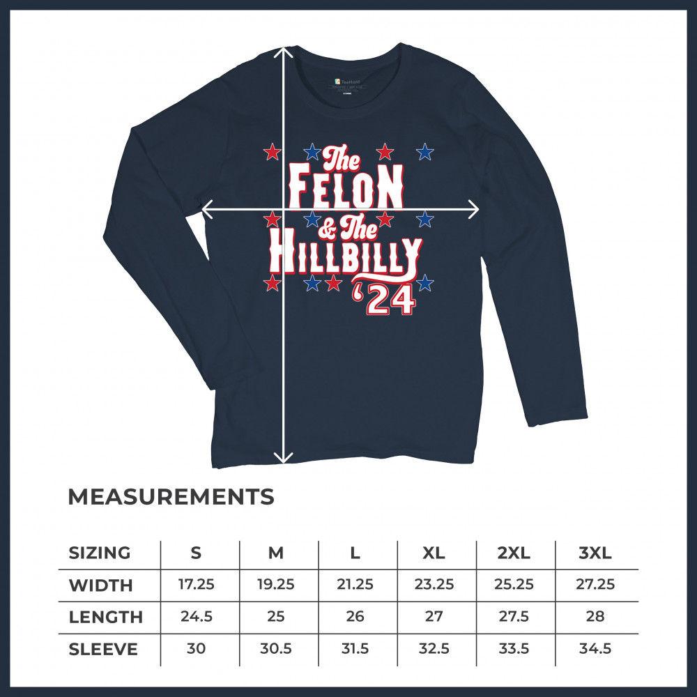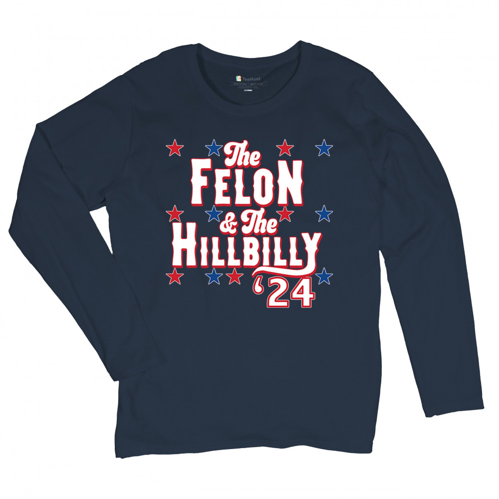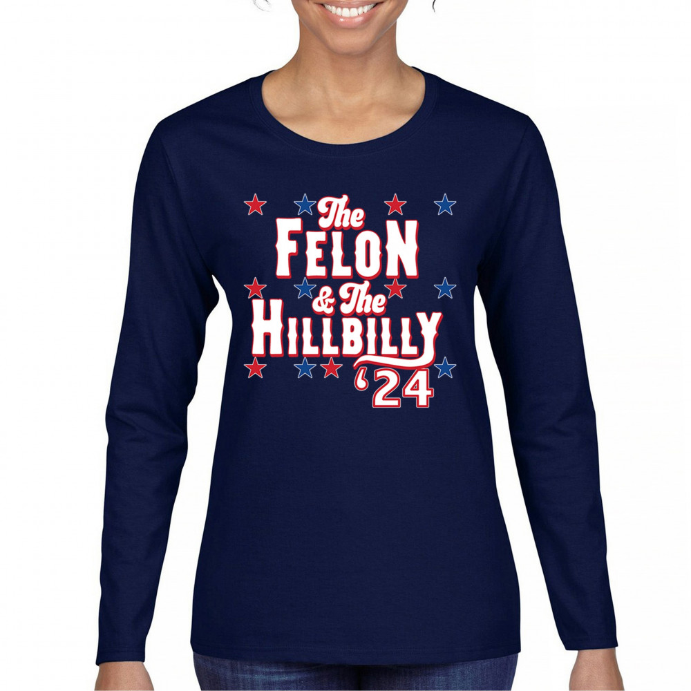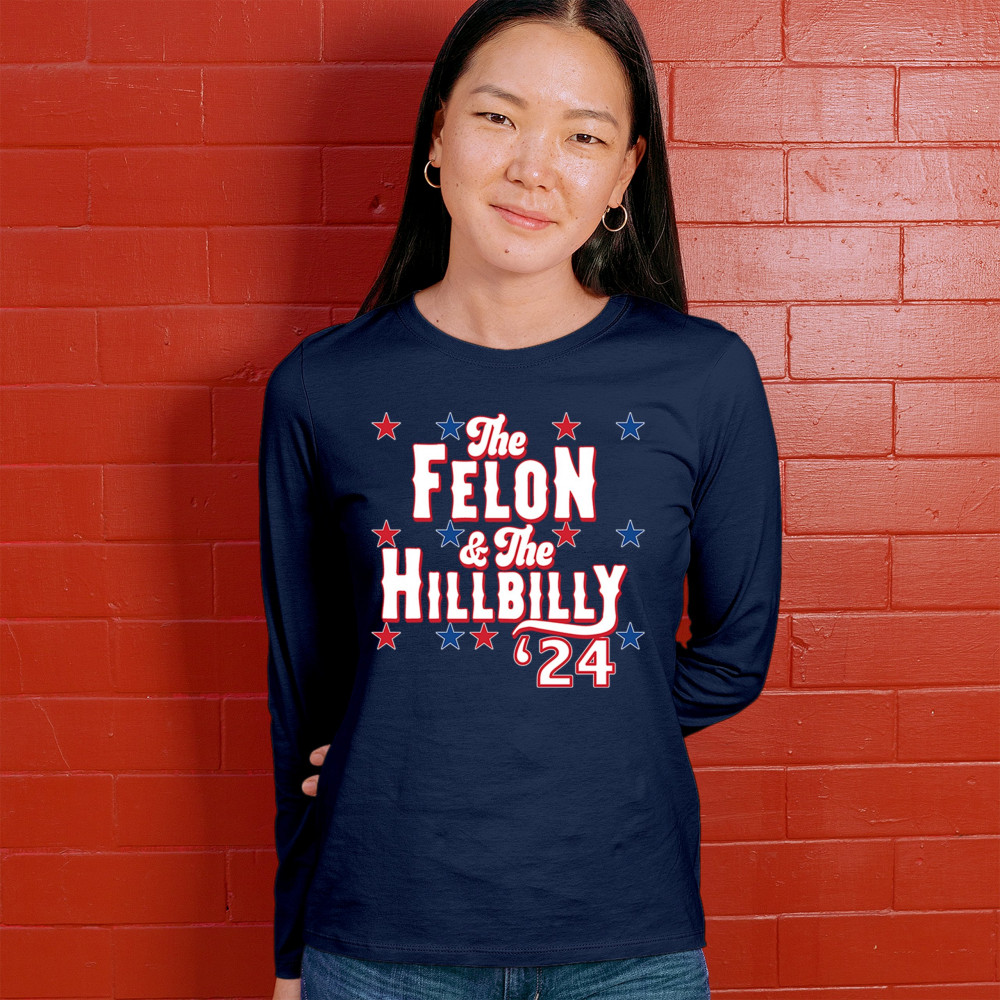 Humorous pro-Trump and Vance design for the 2024 election. "The Felon & The Hillbilly '24" captures conservative pride and humor in one bold statement.