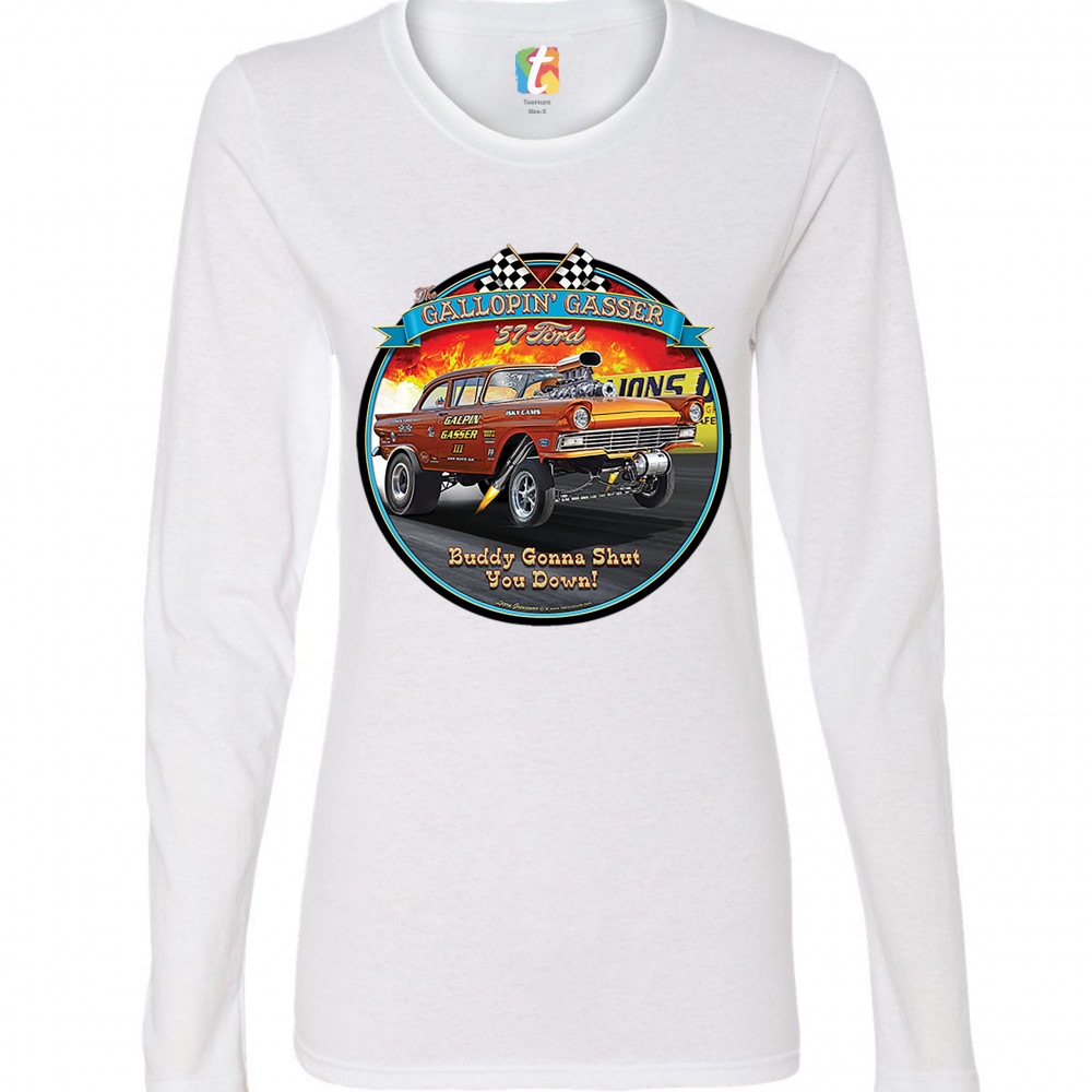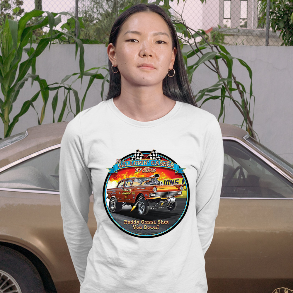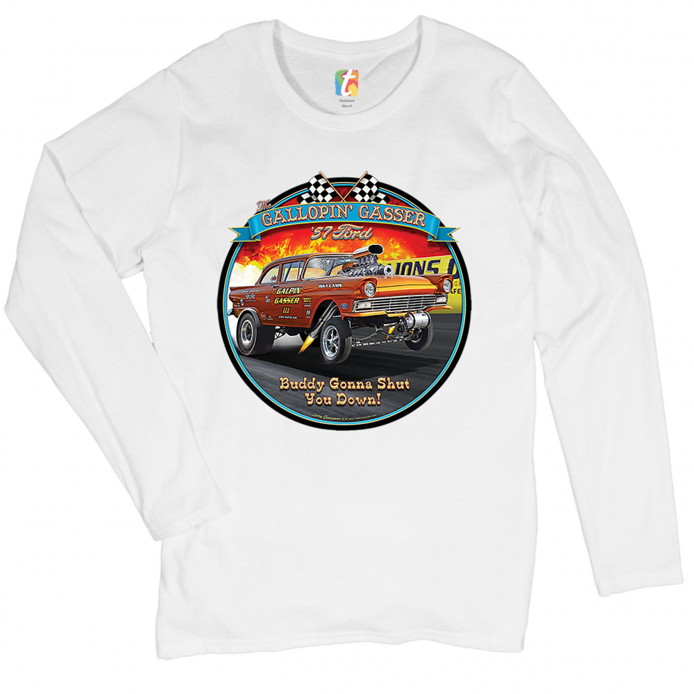 A print featuring a supercharged Ford Gasser sprinting on it's rear wheels in a drag race leaving burning tracks behind it. The print also features a pair of racing flags and says: "The Gallopin' Gasser '57 Ford" and "Buddy Gonna Shut You Down!". A great
