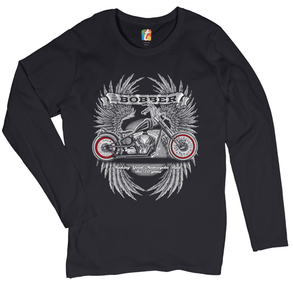 A print featuring a bobber motorcycle and a pair of wings in the background. At the top there is a stripe with "The great American bobber" written on it. At the bottom the print says: "making good motorcycles bad for 70 years". A great choice for a motorc