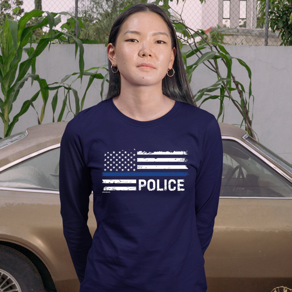THIN BLUE LINE AMERICAN FLAG women's long sleeve t-shirt police law enforcement navy blue