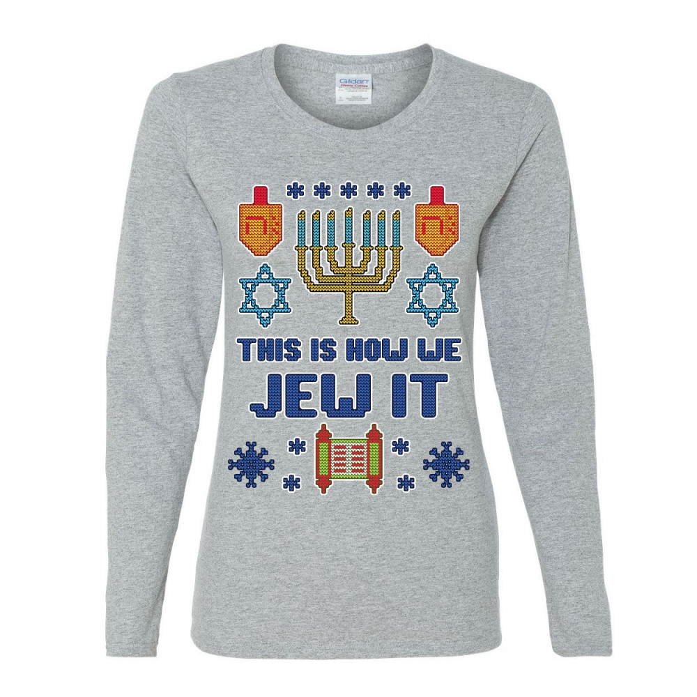 THIS IS HOW WE JEW IT UGLY SWEATER this is how we jew it ugly women's long sleeve tee hannukah torah menorah funny gray