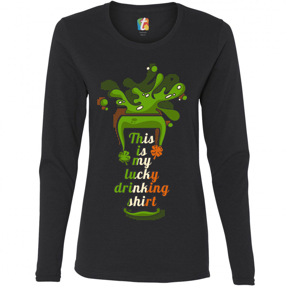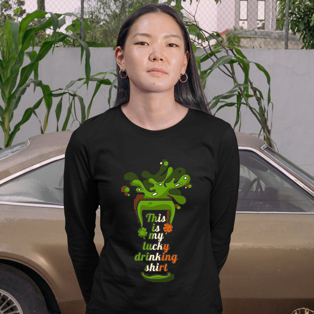 A print featuring a silhouette of a glass with beer spilling out of it. Inside the glass there is a text: "This is my lucky drinking shirt" in the colors of the flag of Ireland. A great choice to wear on March 17 to celebrate the St. Patrick's Day and sho