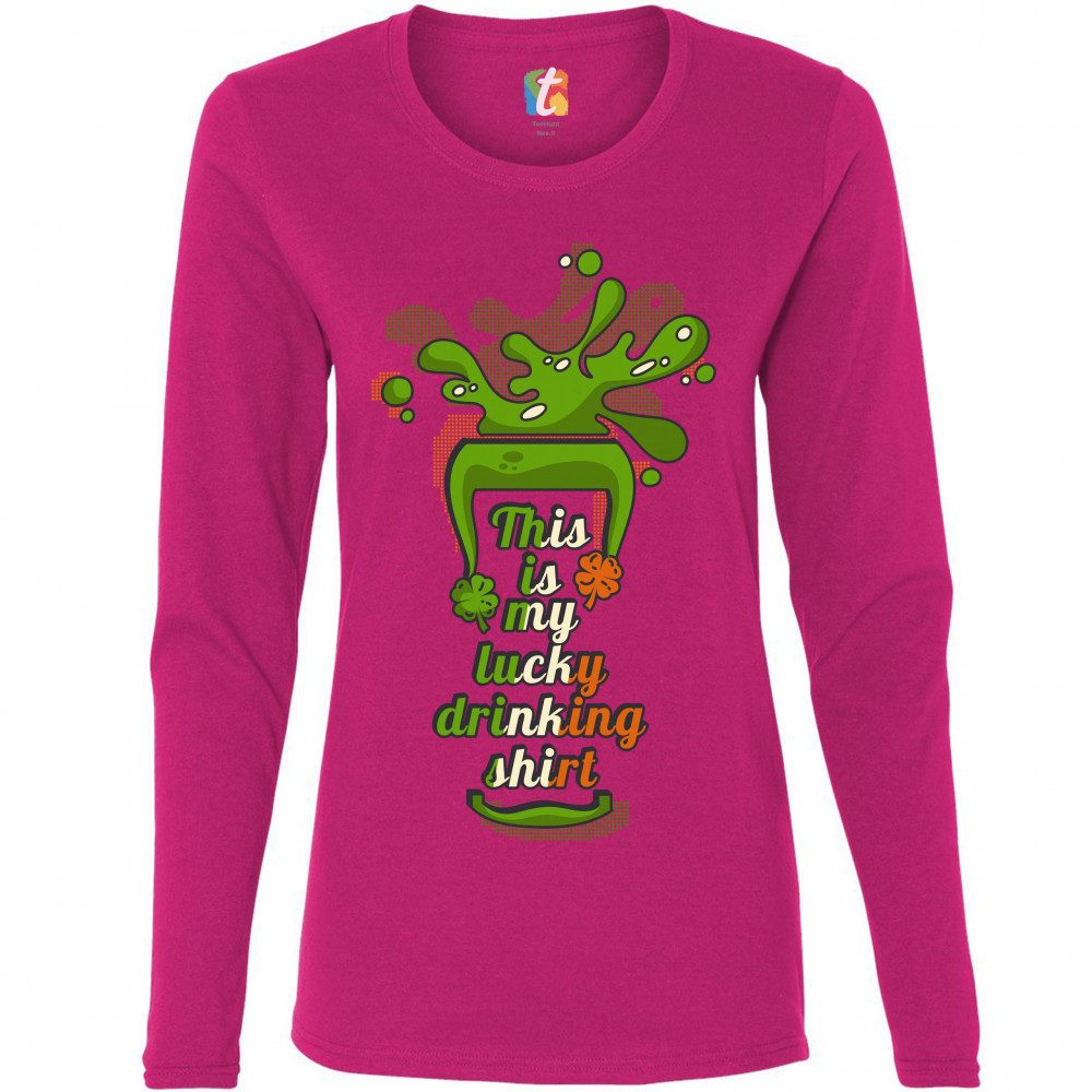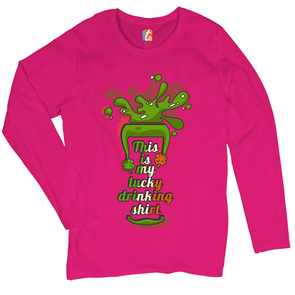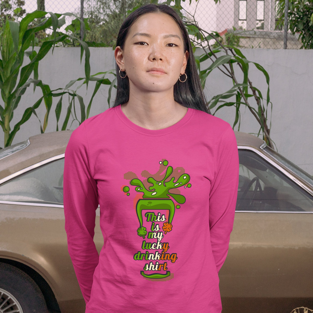 A print featuring a silhouette of a glass with beer spilling out of it. Inside the glass there is a text: "This is my lucky drinking shirt" in the colors of the flag of Ireland. A great choice to wear on March 17 to celebrate the St. Patrick's Day and sho