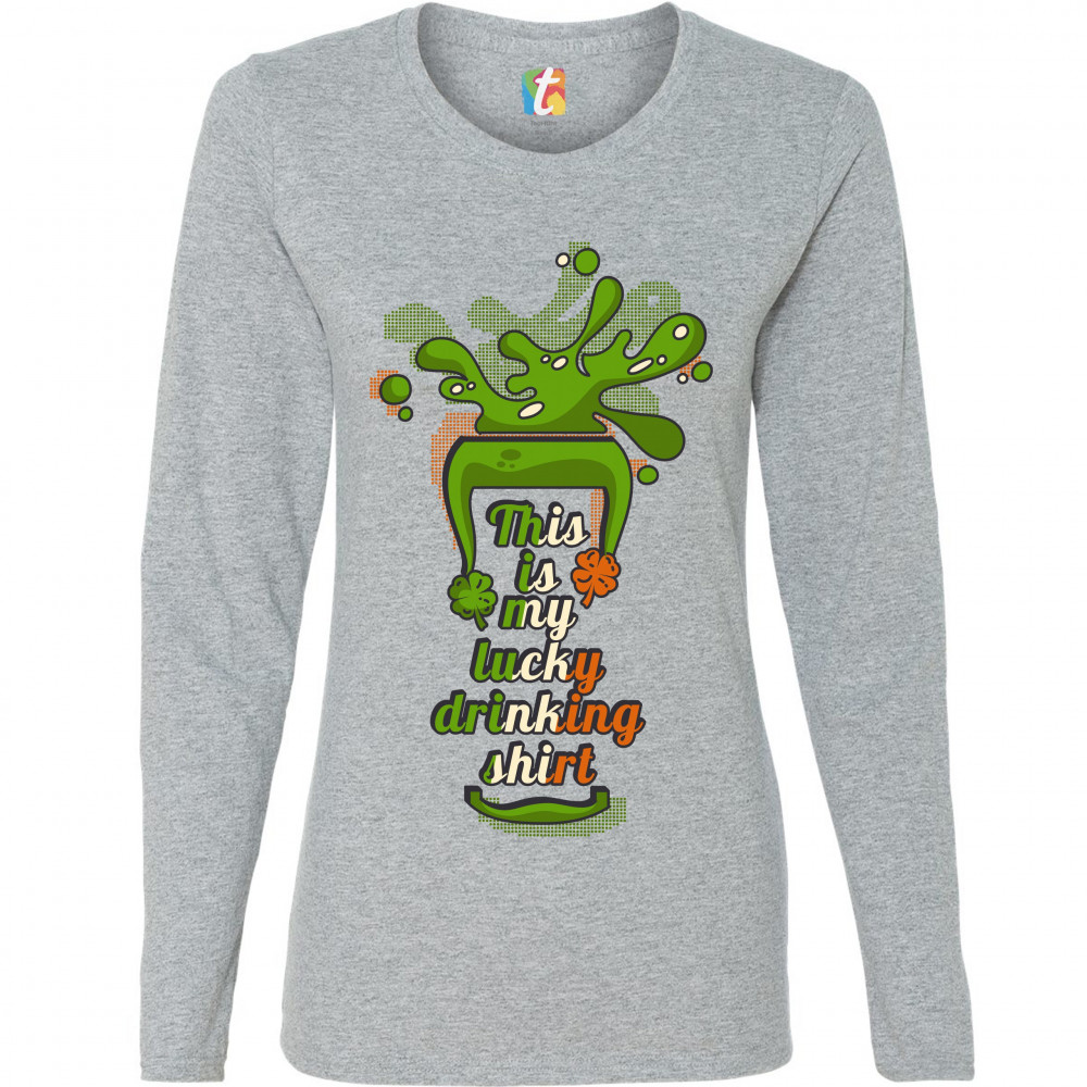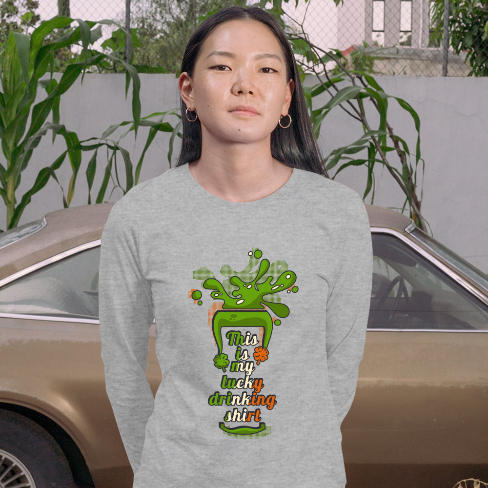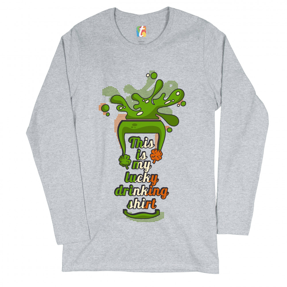 A print featuring a silhouette of a glass with beer spilling out of it. Inside the glass there is a text: "This is my lucky drinking shirt" in the colors of the flag of Ireland. A great choice to wear on March 17 to celebrate the St. Patrick's Day and sho
