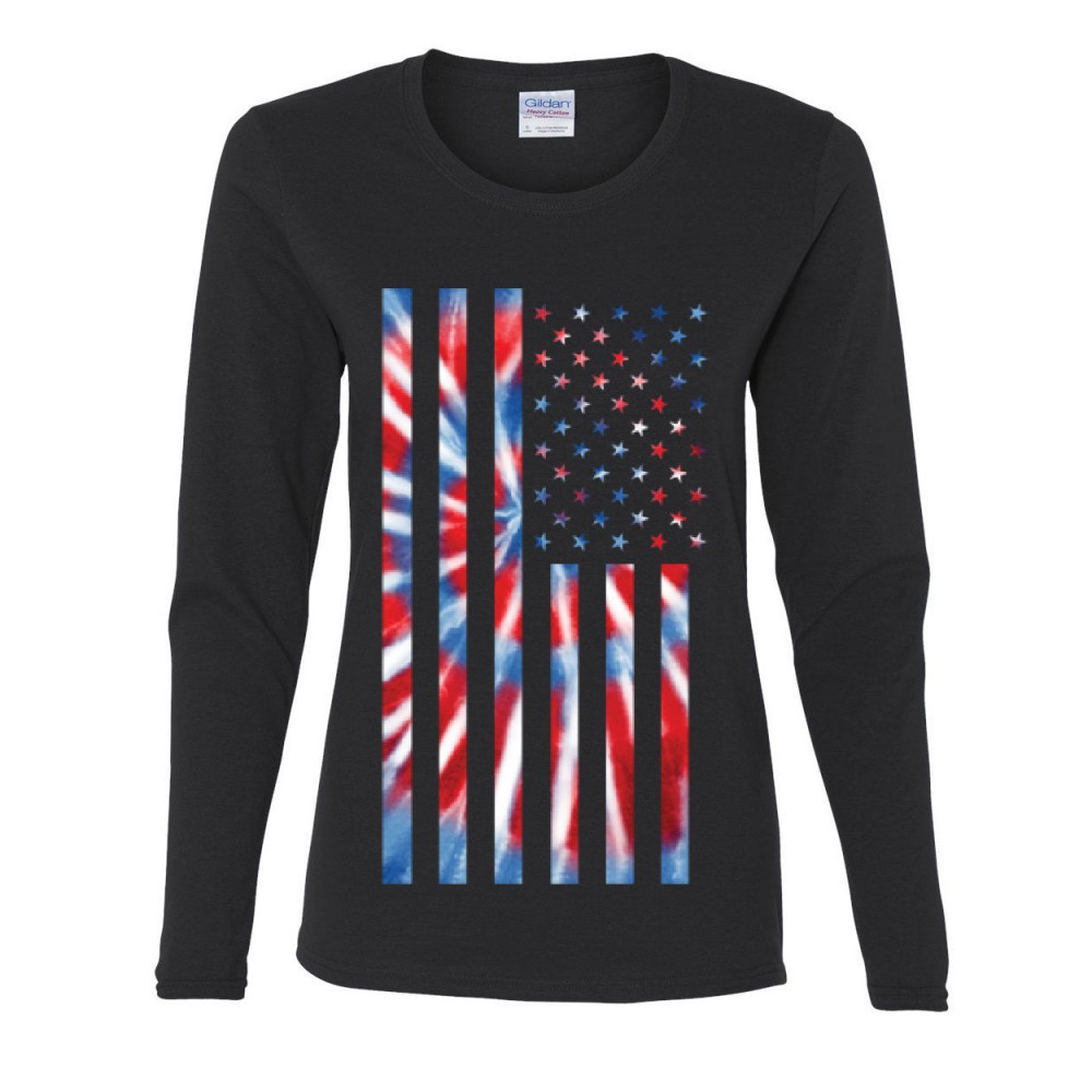 TIE-DYE AMERICAN FLAG women's long sleeve tee 4th of july stars and stripes black