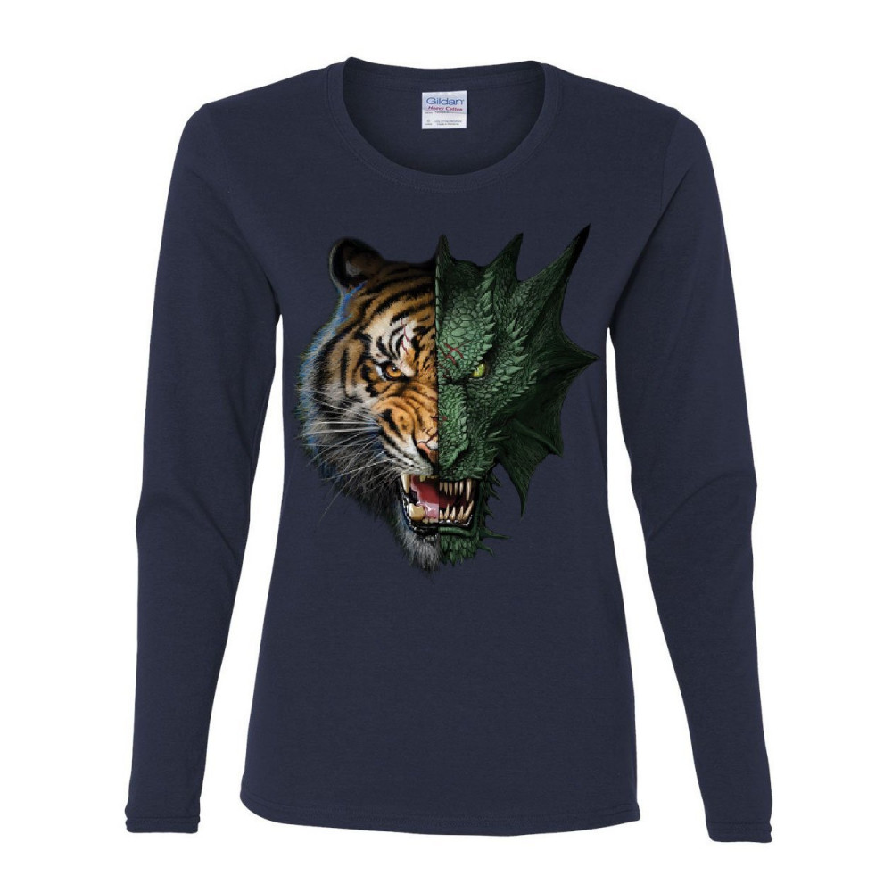 TIGER DRAGON FACE tiger and dragon face women's long sleeve tee animal beast fantasy monster fang navy blue