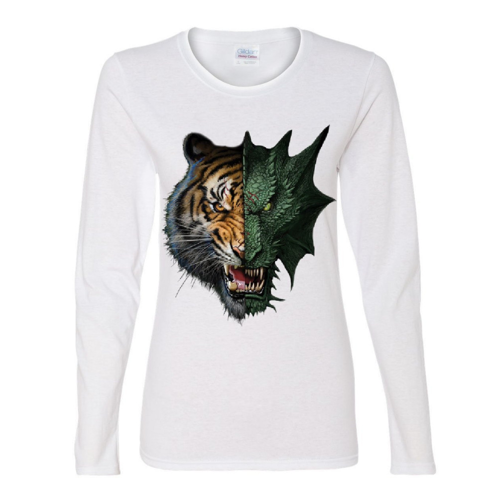 TIGER DRAGON FACE tiger and dragon face women's long sleeve tee animal beast fantasy monster fang white