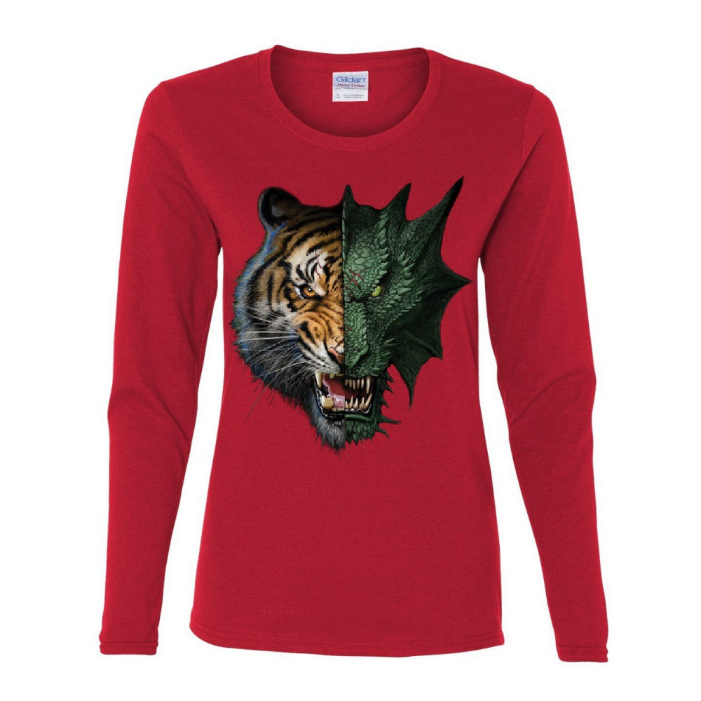 TIGER DRAGON FACE tiger and dragon face women's long sleeve tee animal beast fantasy monster fang red