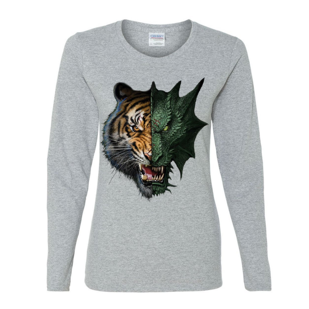 TIGER DRAGON FACE tiger and dragon face women's long sleeve tee animal beast fantasy monster fang gray