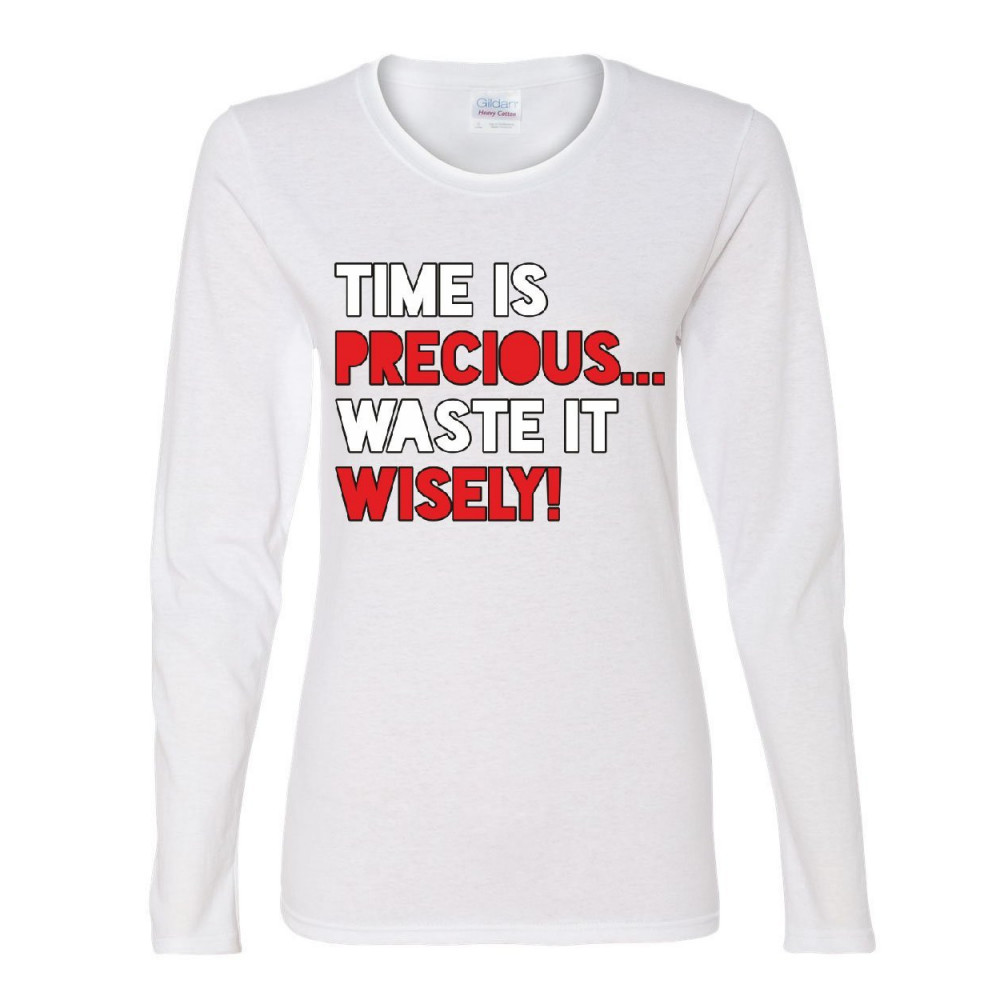 TIME IS PRECIOUS WASTE IT WISELY! time is precious waste it wisely women's long sleeve tee college humor lazy fun white