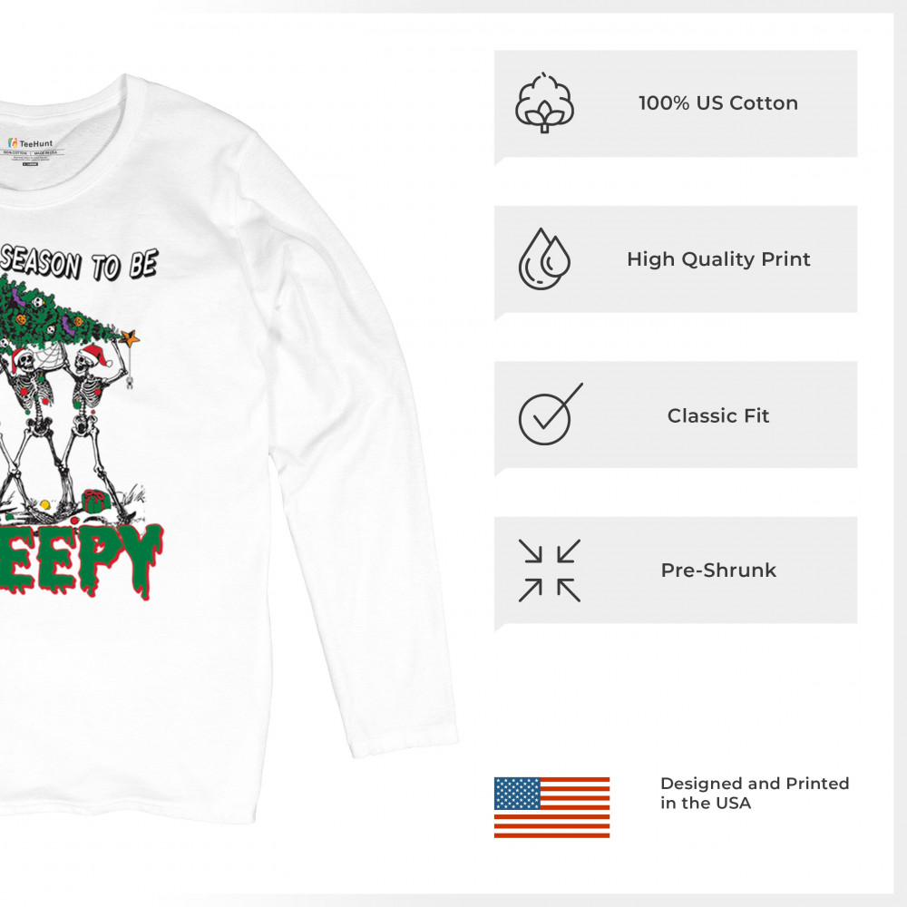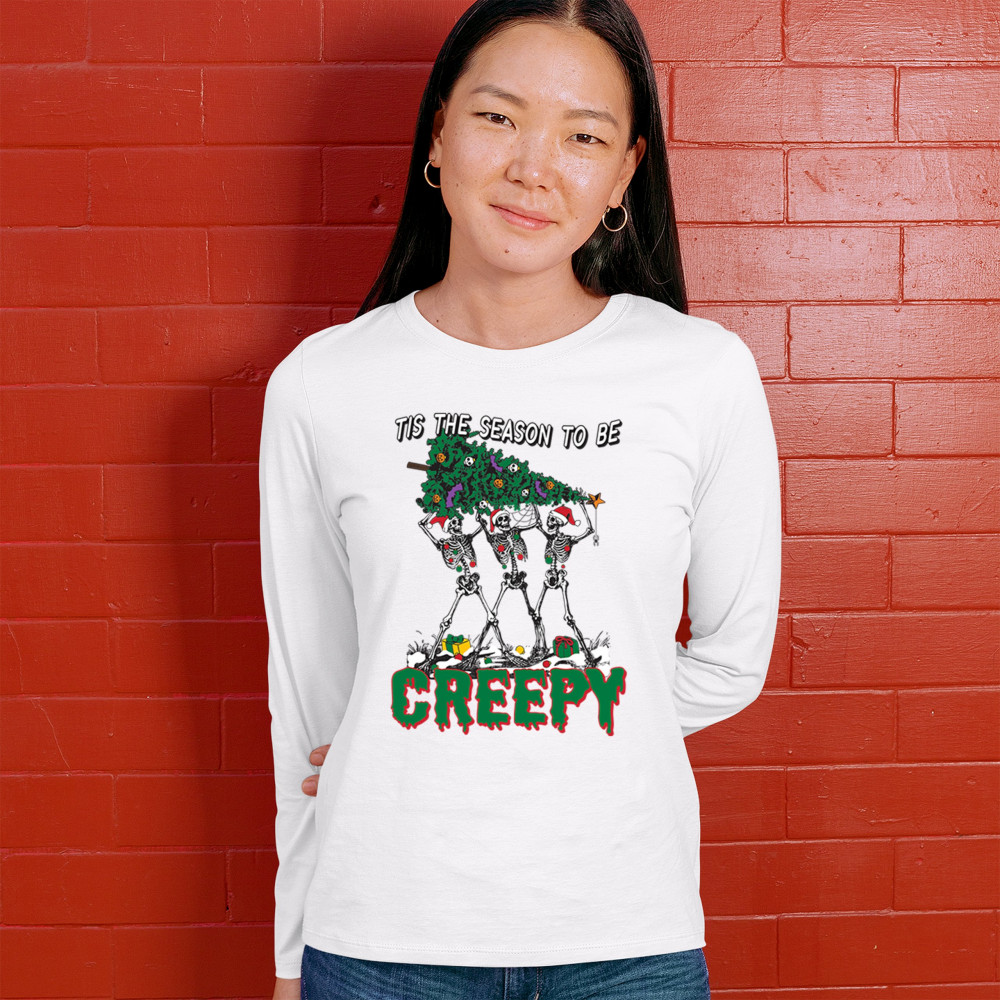 "Tis the Season to Be Creepy" combines holiday cheer with a hauntingly fun twist. This creative design features skeletons donning Santa hats as they carry a spooky Christmas tree decorated with eerie ornaments. Perfect for holiday gatherings, Secret Santa gifts, or themed parties, this design celebrates the festive and the macabre. Embrace the jolliest and creepiest bunch this season with this standout apparel.
