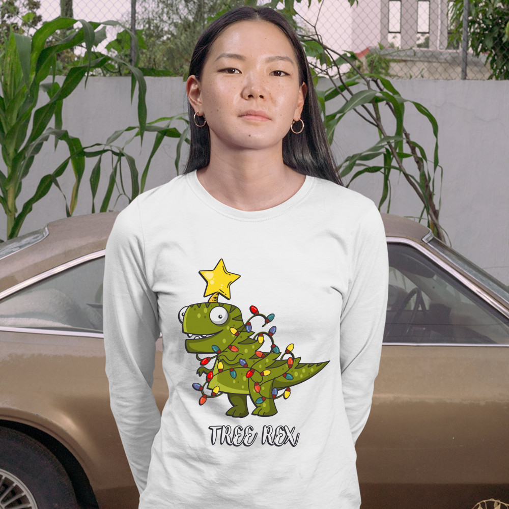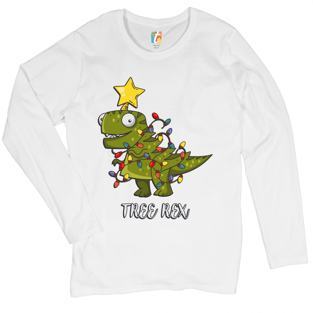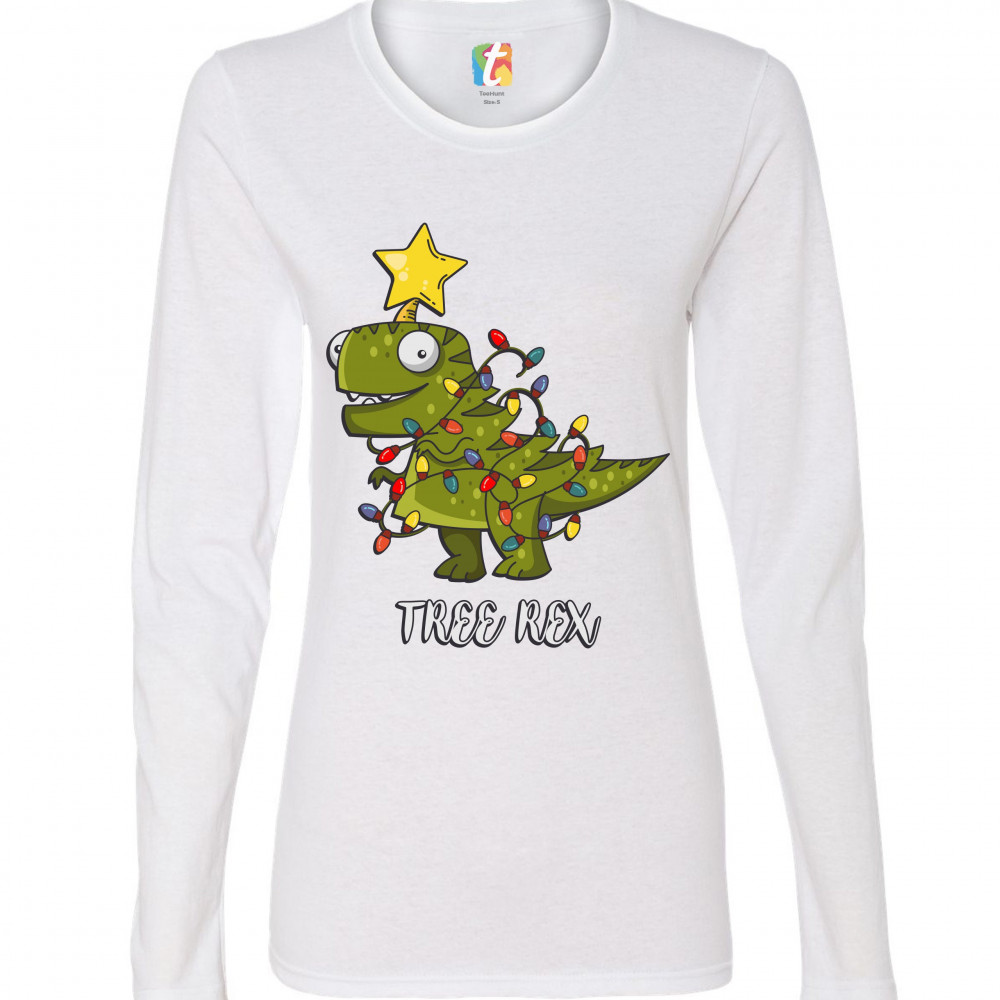 TREE REX women's long sleeve t-shirt tyronnasaurus rex christmas tree dinosaur white