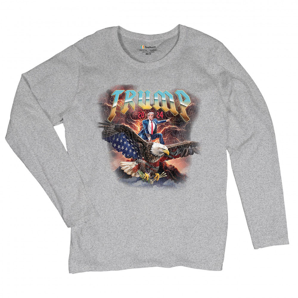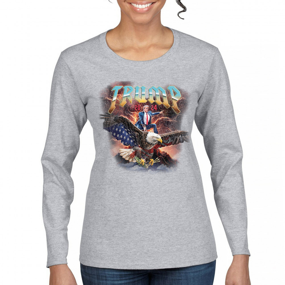 Stand out with our "Trump 2024" design featuring Trump riding an eagle. Perfect for rallies and patriotic events. Show your support with pride and confidence.