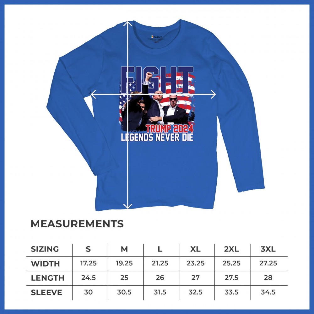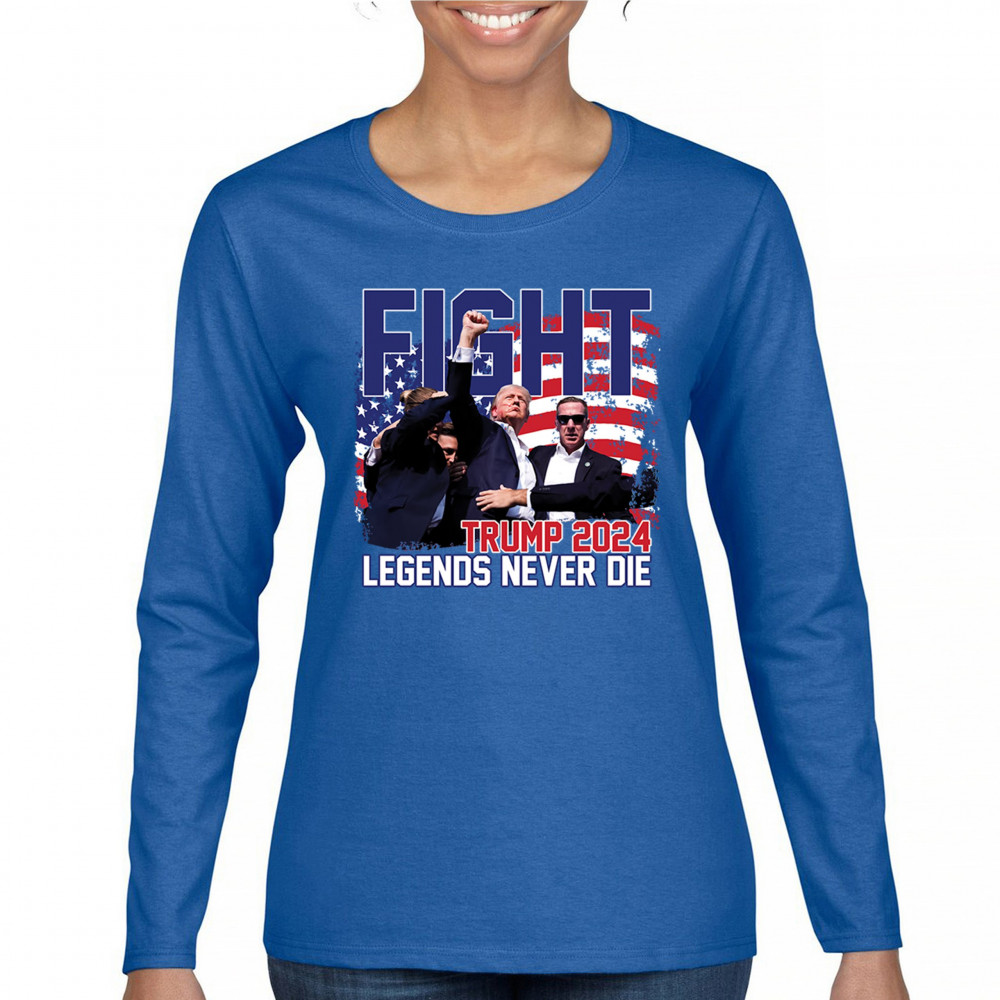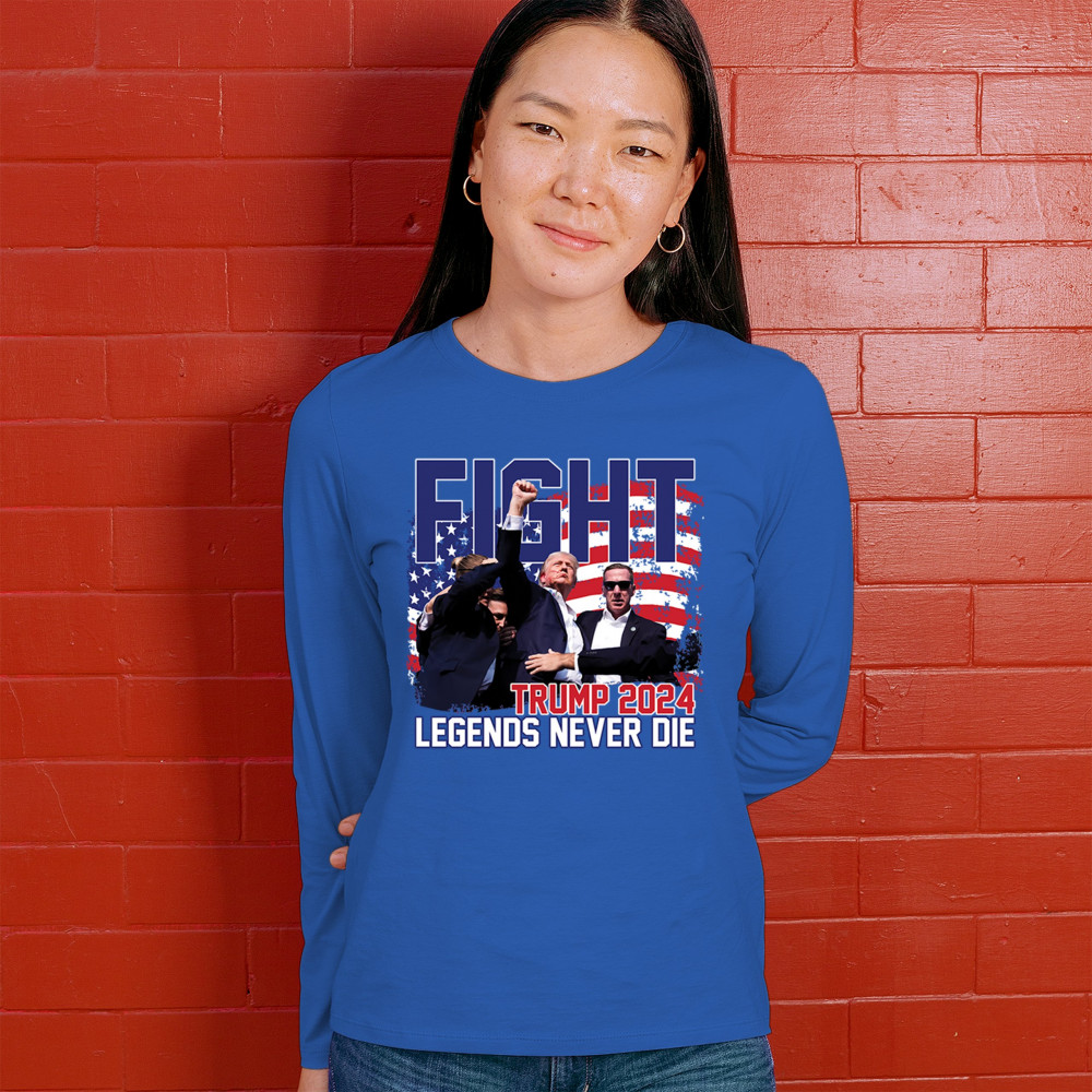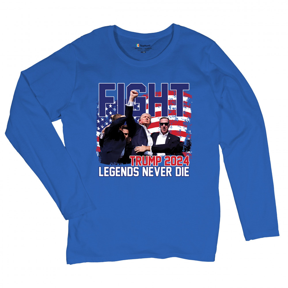 Show your Trump 2024 support with our bold "Fight" design, featuring "Legends Never Die" and a patriotic American flag. Perfect for rallies and everyday wear.