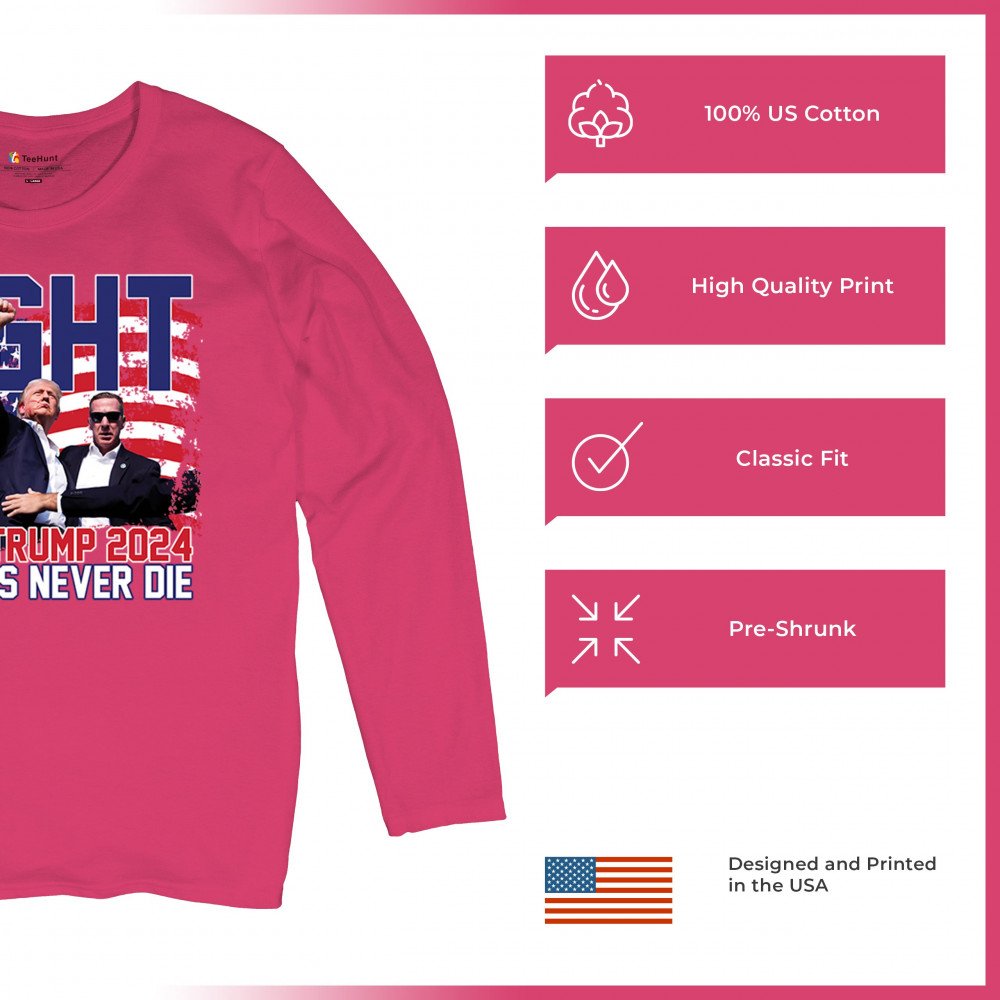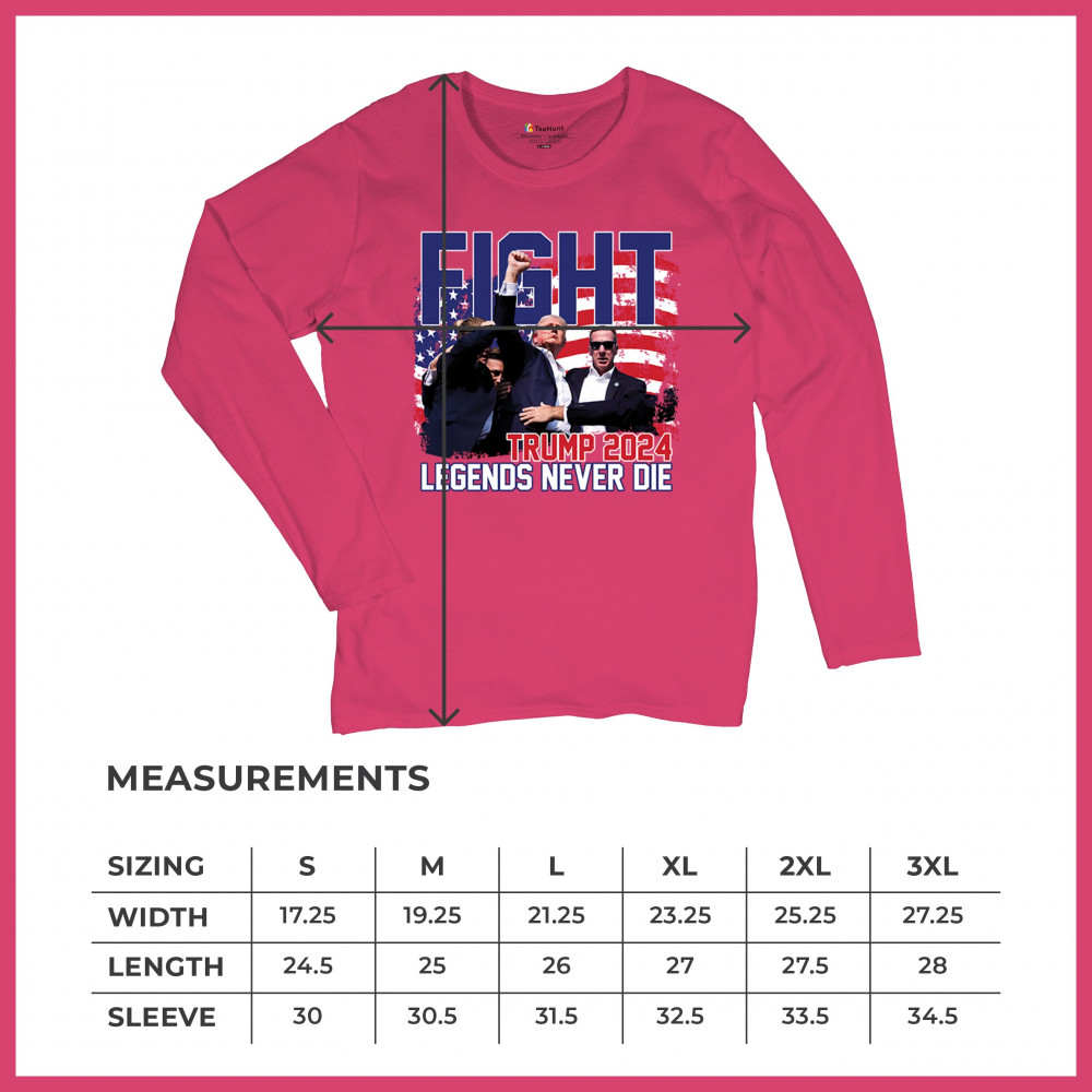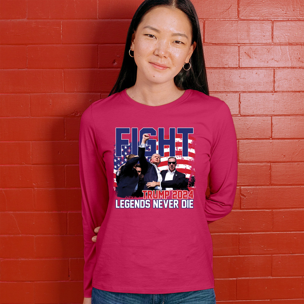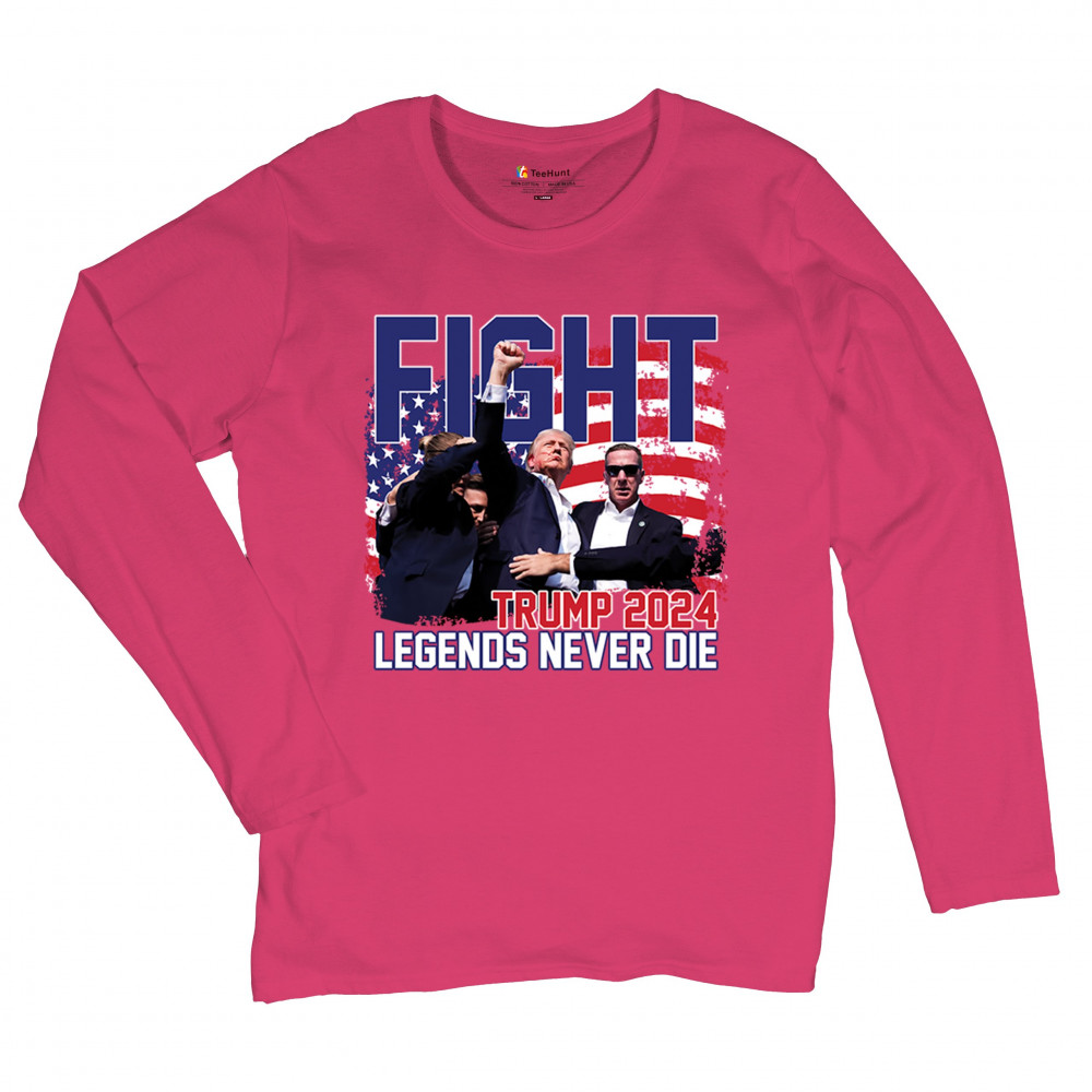Show your Trump 2024 support with our bold "Fight" design, featuring "Legends Never Die" and a patriotic American flag. Perfect for rallies and everyday wear.