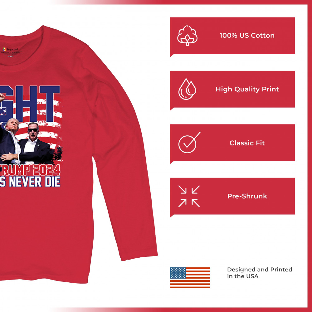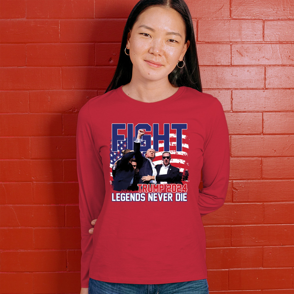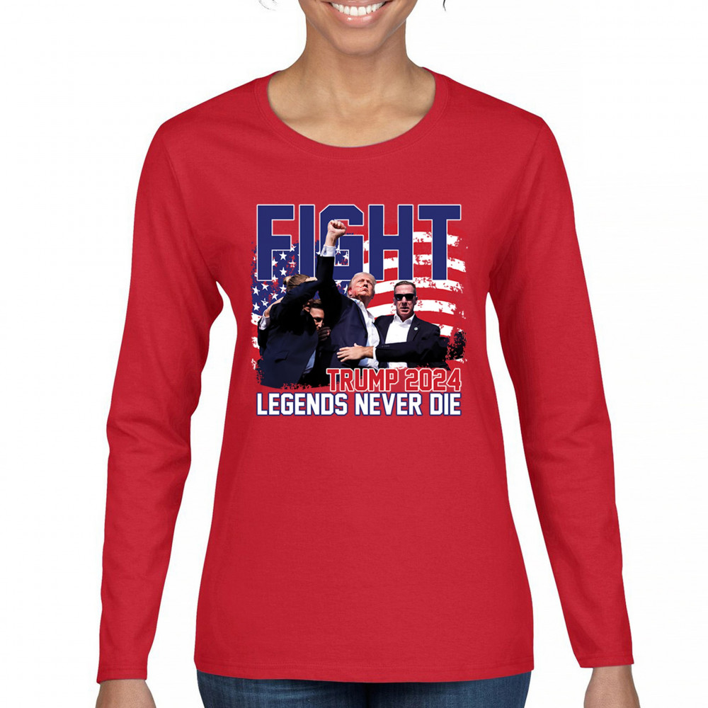 Show your Trump 2024 support with our bold "Fight" design, featuring "Legends Never Die" and a patriotic American flag. Perfect for rallies and everyday wear.