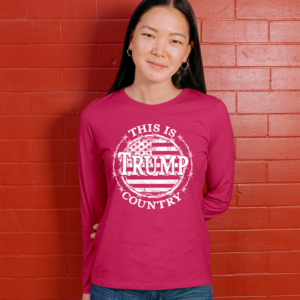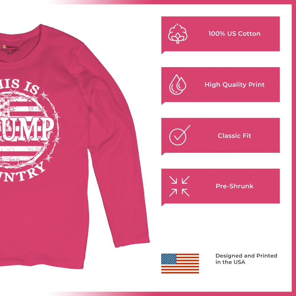 Celebrate your unwavering support for Trump and JD Vance with our exclusive "Trump Country" design. Featuring a vintage American flag encircled by barbed wire, this piece makes a strong statement against Kamala Harris and her policies. It's perfect for conservatives who believe in the America First movement. Whether you're attending a rally, political event, or simply expressing your patriotism, this design is ideal for showcasing your values and support for Trump's vision for America.