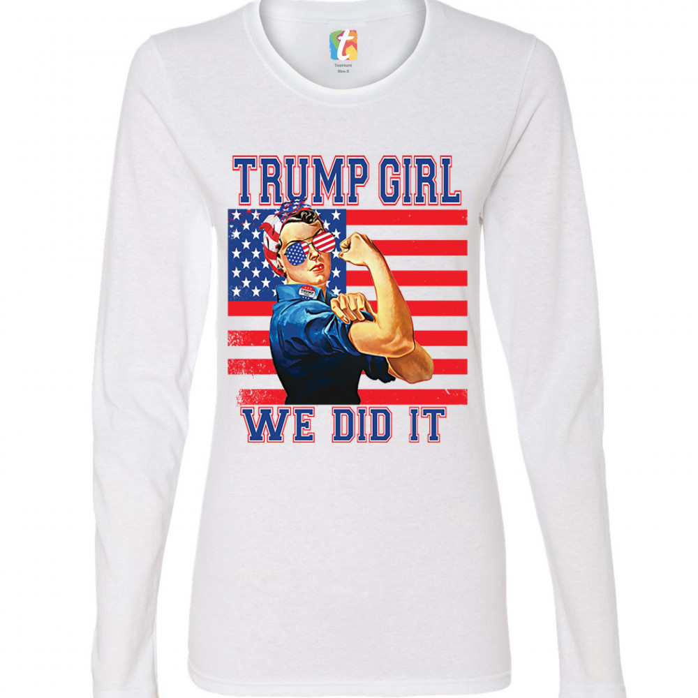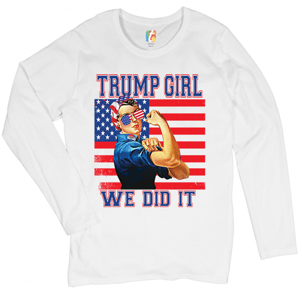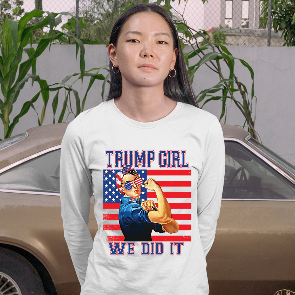 A political print saying "Trump girl, we did it". The print features the WWII icon Rosie the Riveter wearing American flag bandana and glasses. She also wears a "Trump 2020" badge. In the background there is the American Flag. A great choice to wear for a