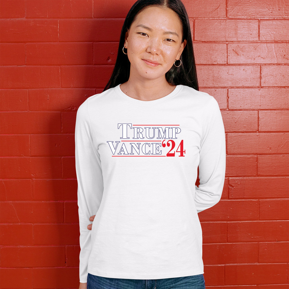 Show your support for Trump Vance 2024 with this patriotic design featuring bold red, white, and blue colors and a flag background. Perfect for rallies and conservative events.