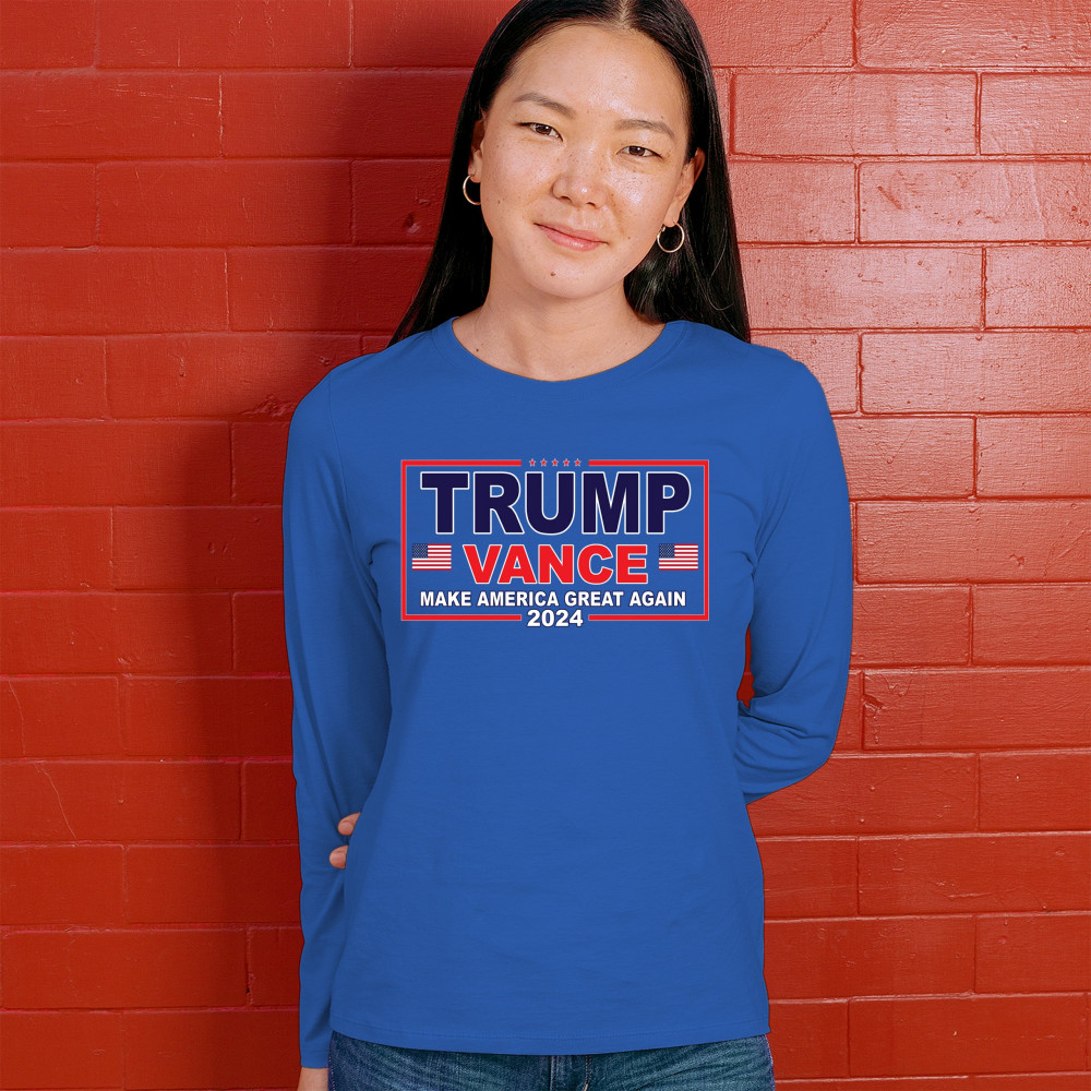 Showcase your support for the Trump-Vance 2024 campaign with this bold patriotic design featuring the American flag and "Make America Great Again" slogan.
