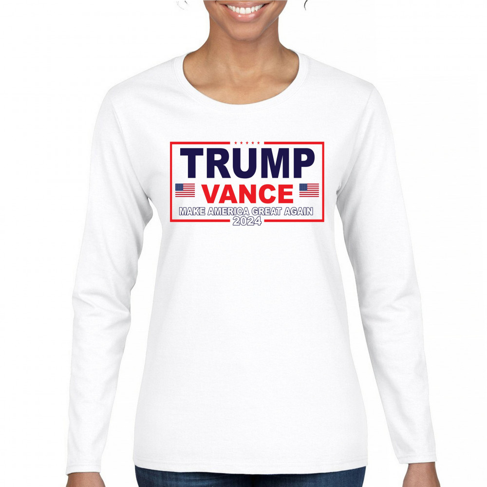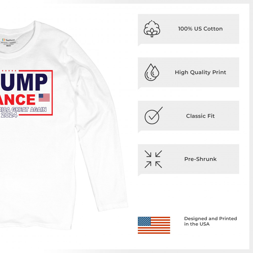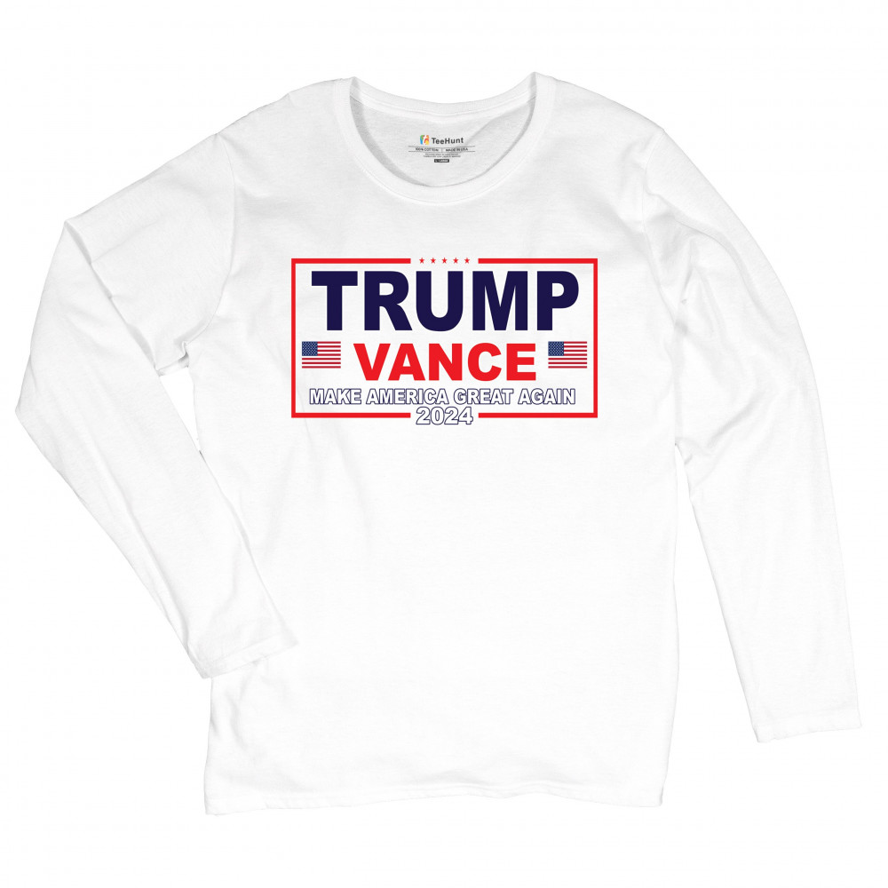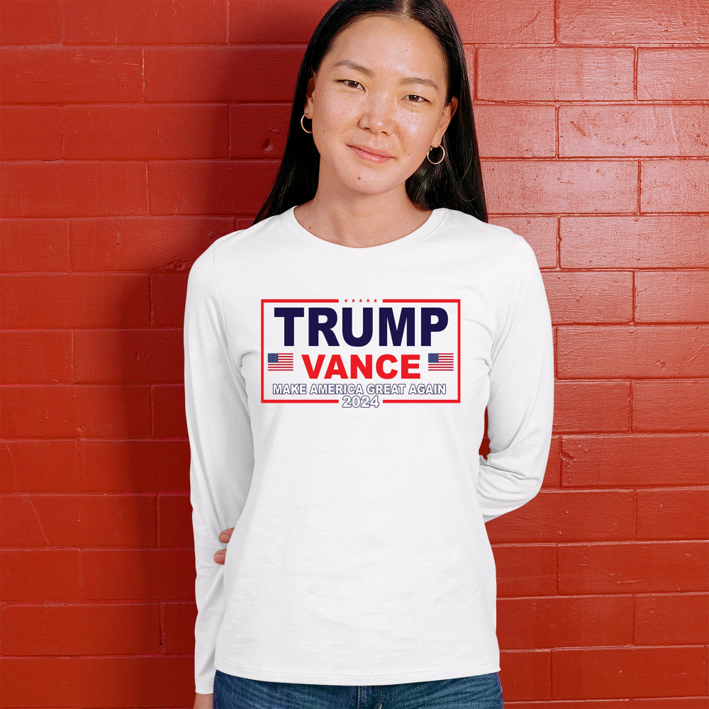 Showcase your support for the Trump-Vance 2024 campaign with this bold patriotic design featuring the American flag and "Make America Great Again" slogan.